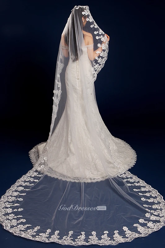 Long Tail Wedding Veil with Flowers Beading and Lace Edge