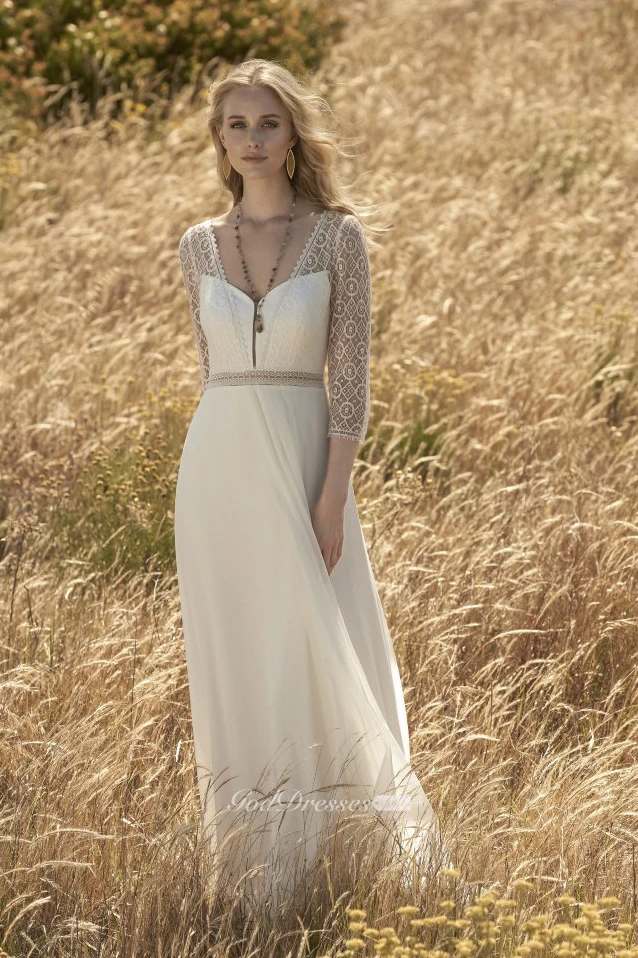 3/4 Sleeve Elegant Chiffon Wedding Dress With Lace Top And Keyhole Back