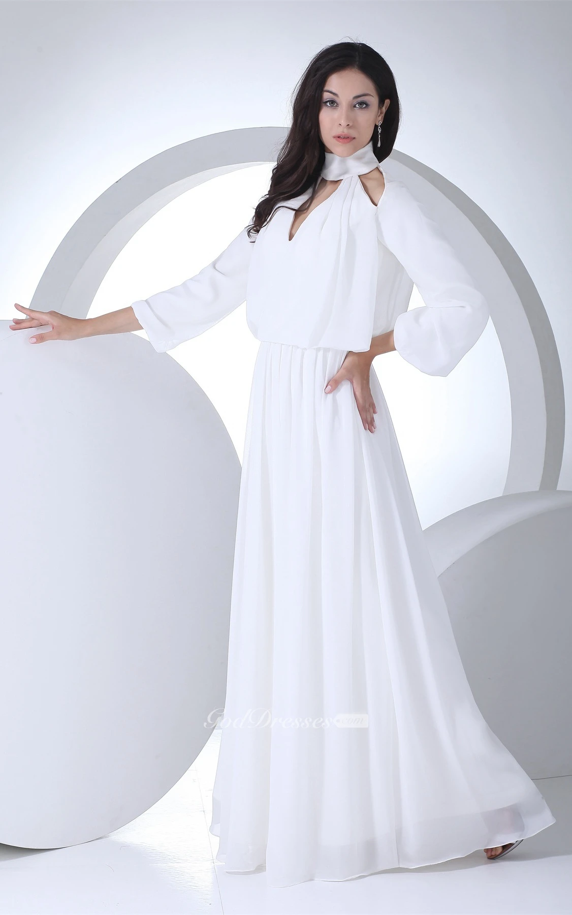 3-4 Sleeve High Neck A-Line Chiffon Dress With Pleats and Zipper Back