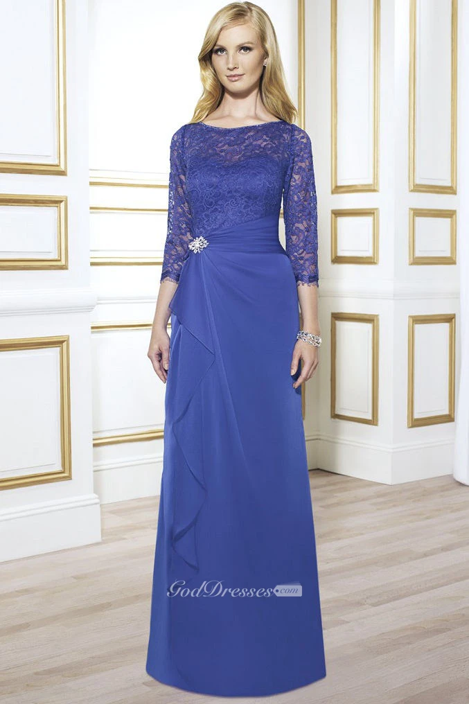 3-4 Sleeve Lace Bateau Neck Chiffon Formal Dress With Broach And Draping