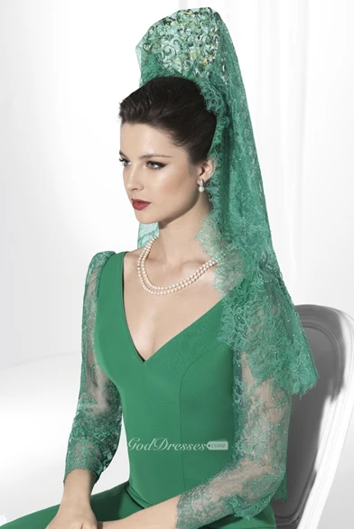 3-4-Sleeve V-Neck Lace Floor-Length Jersey Prom Dress