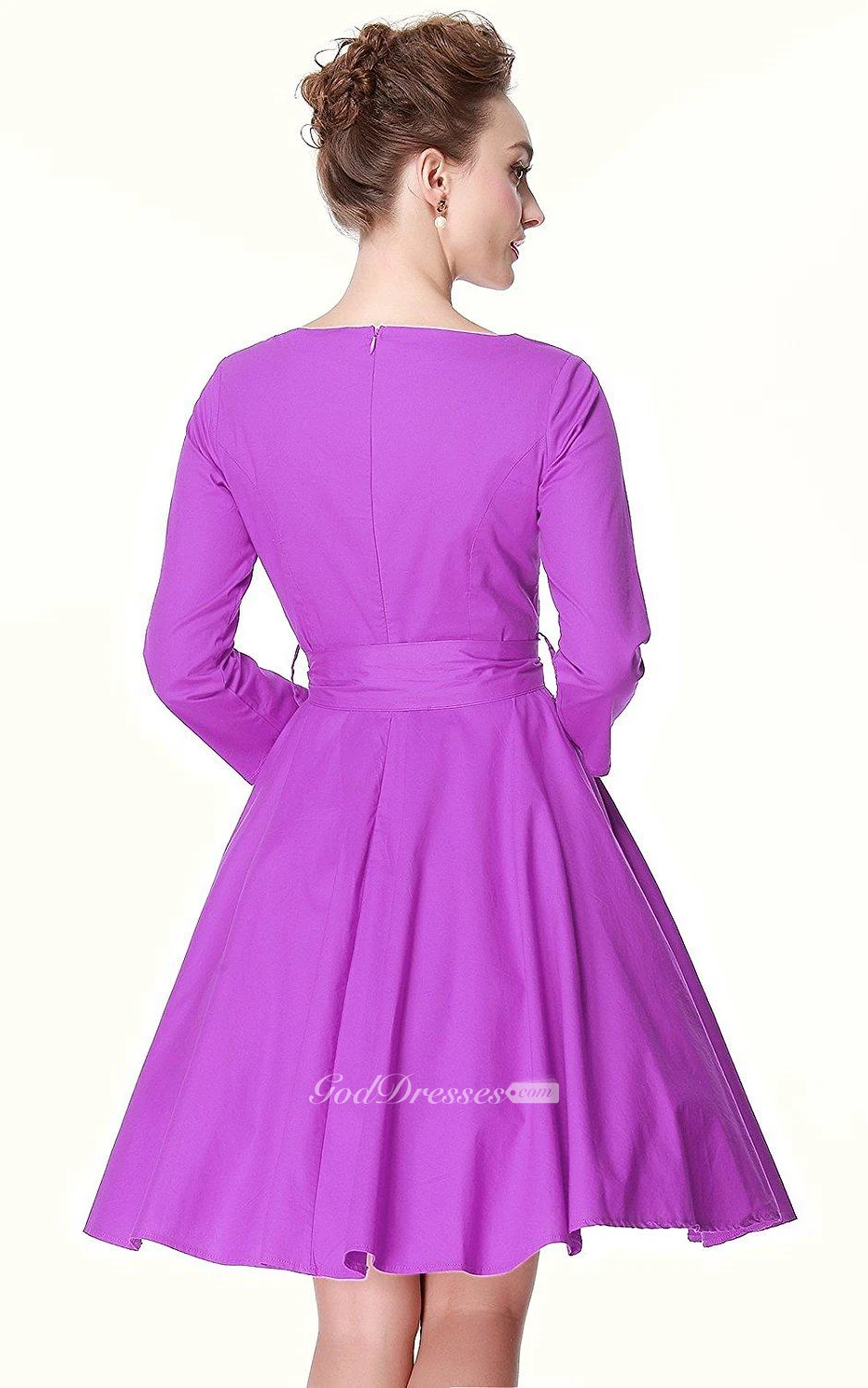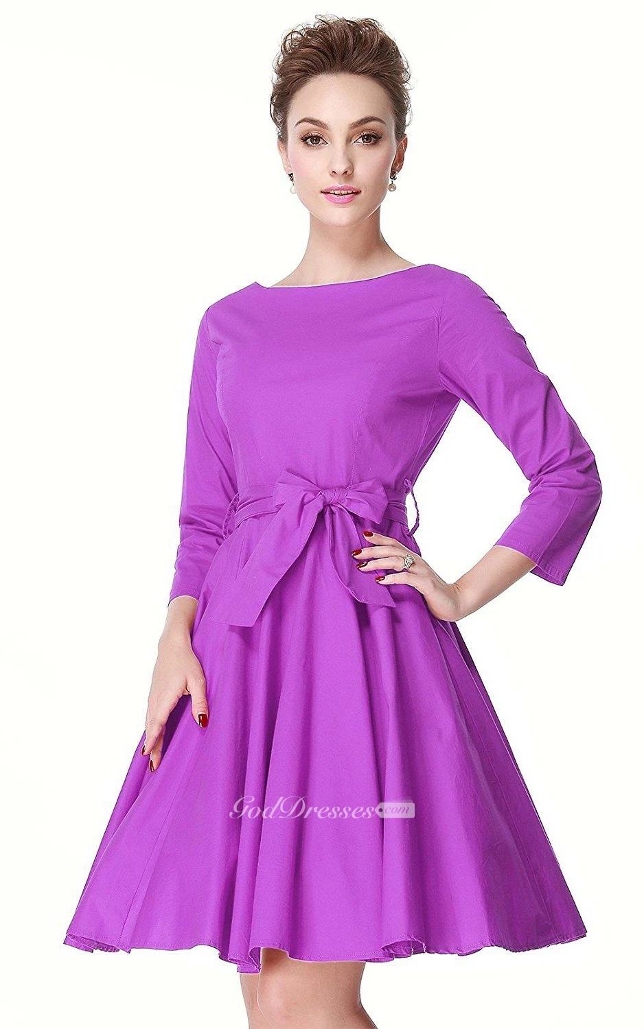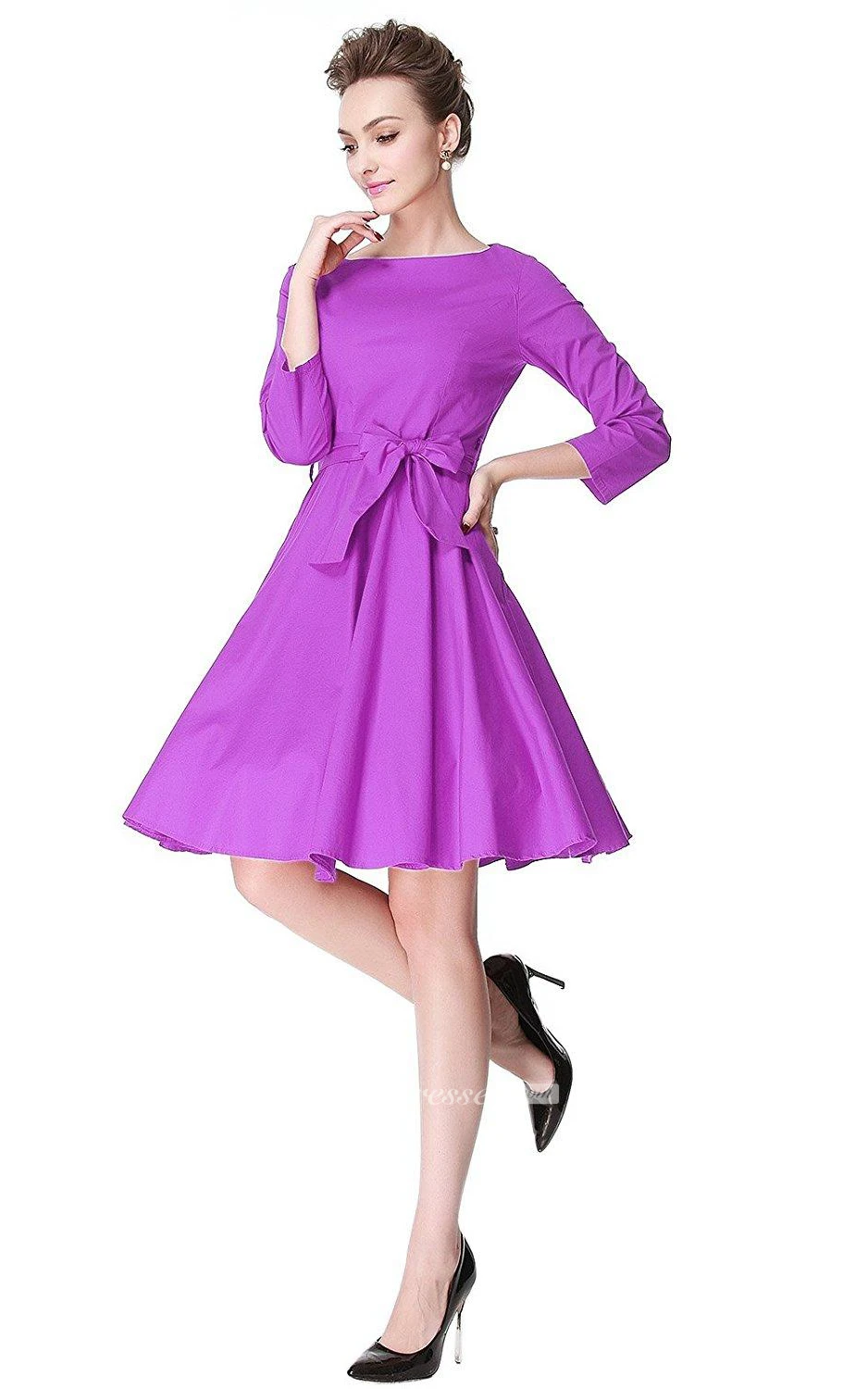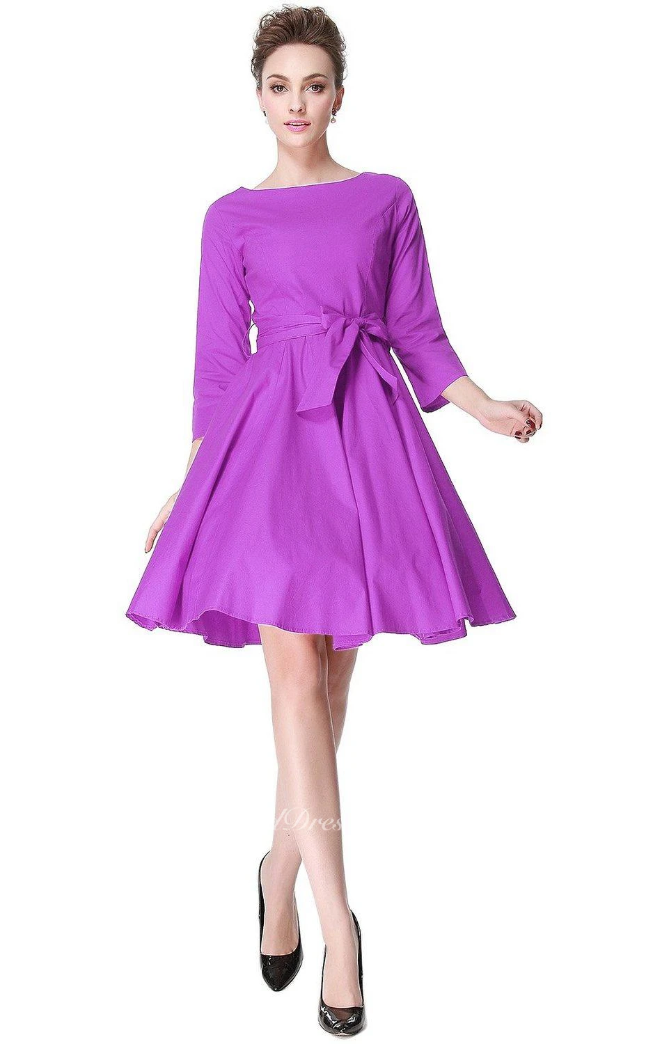 3-4 Sleeved A-line Dress with Pleats and Bow
