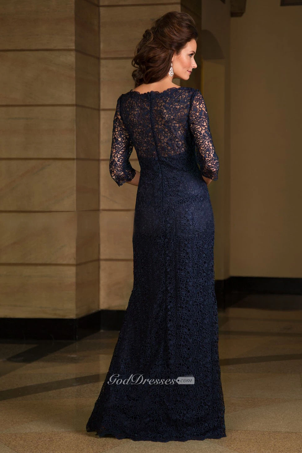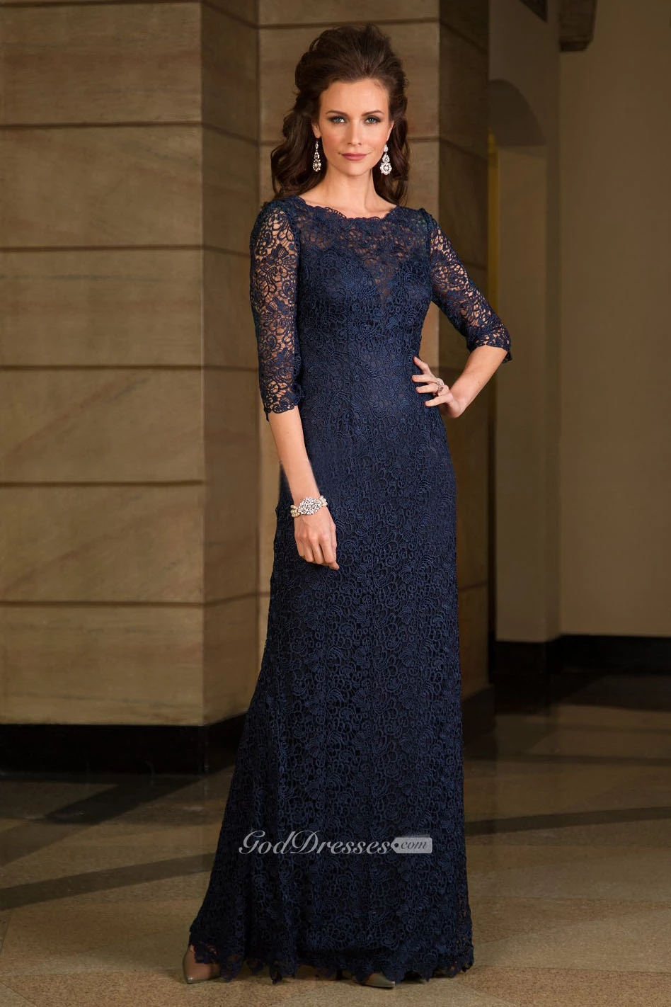 3-4 Sleeved Long Lace Mother Of The Bride Dress With Illusion Style