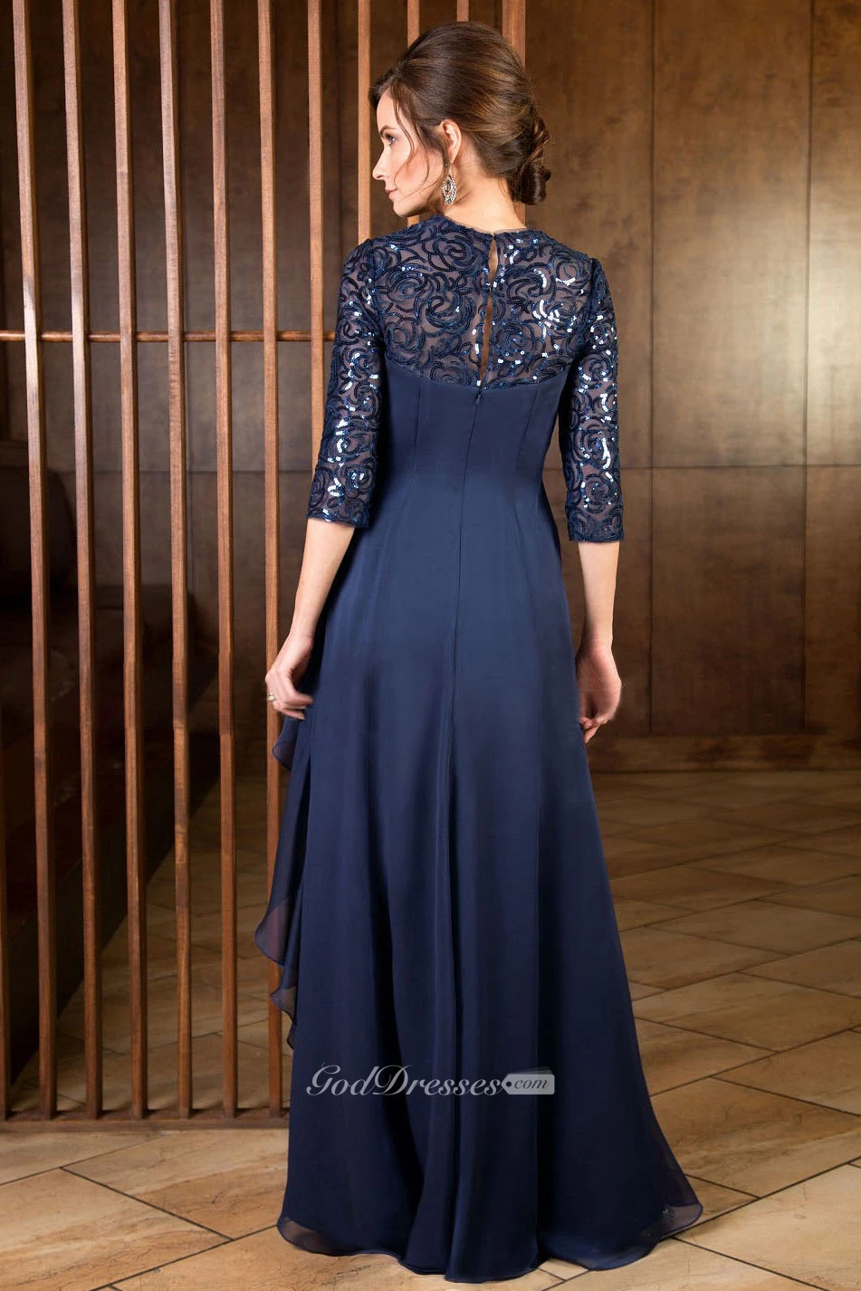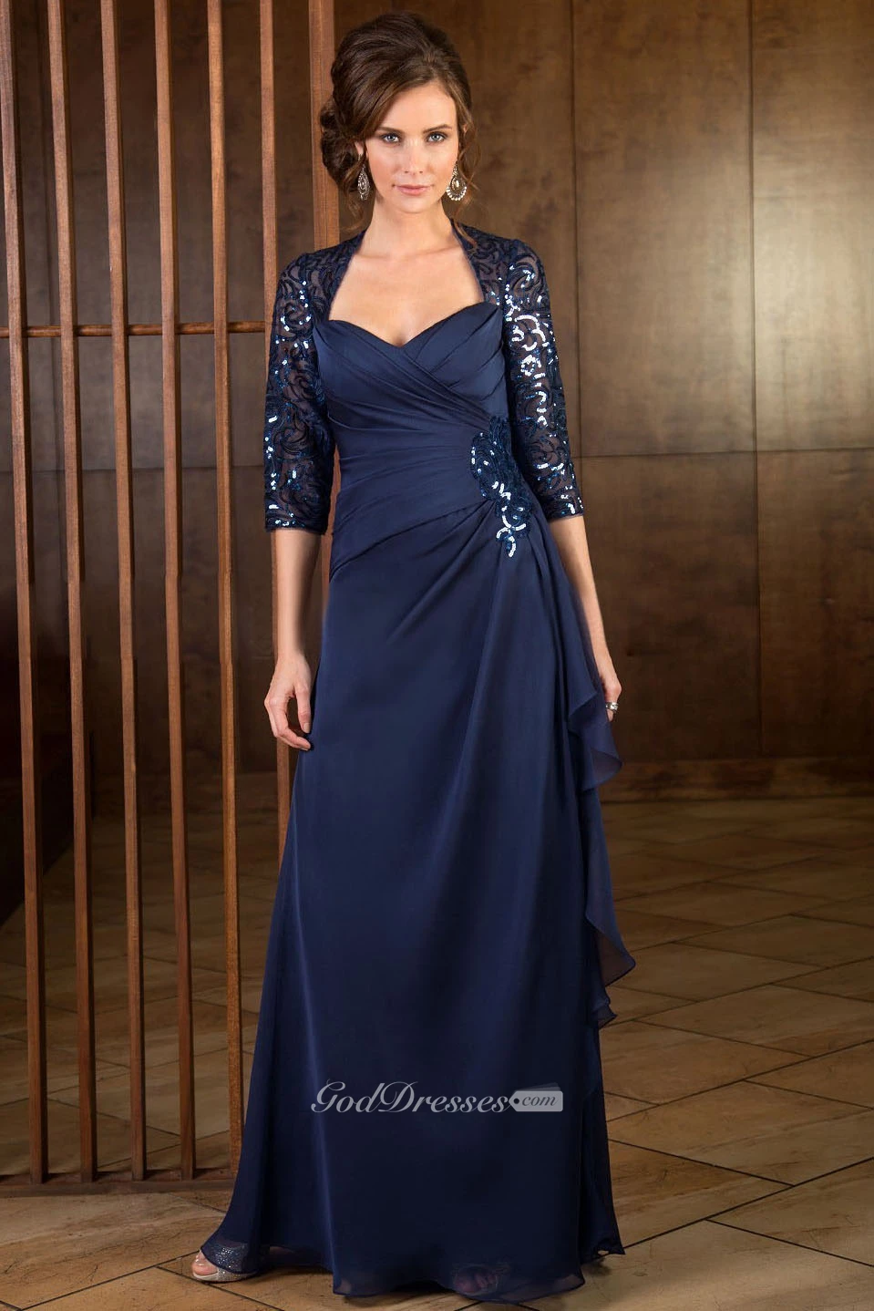 3-4 Sleeved Long Mother Of The Bride Dress With Ruffles And Sequins