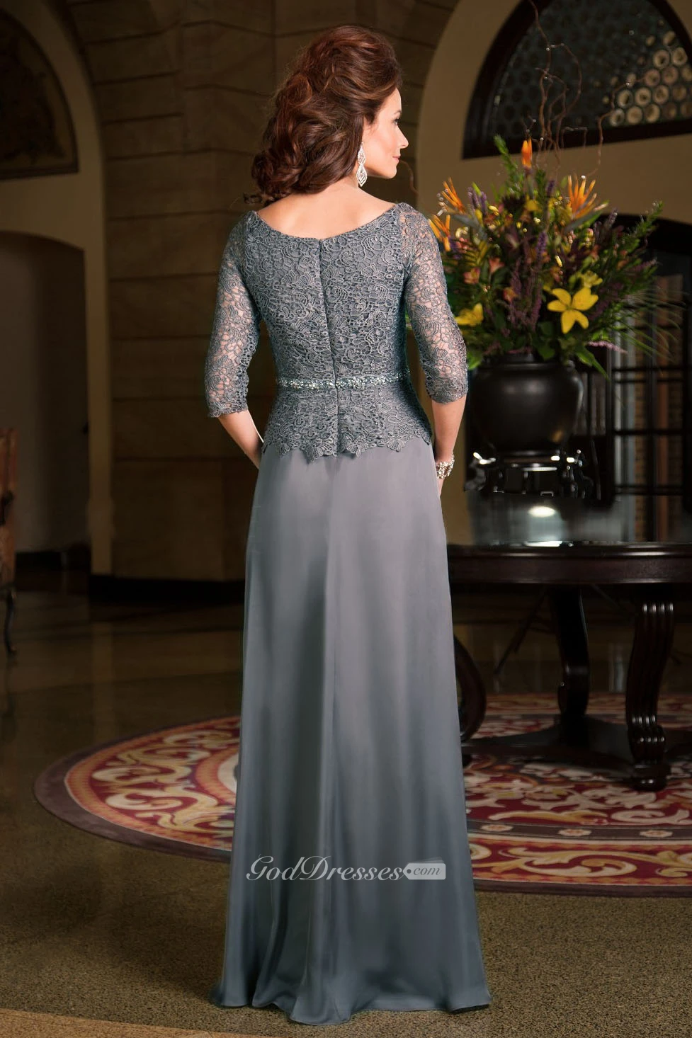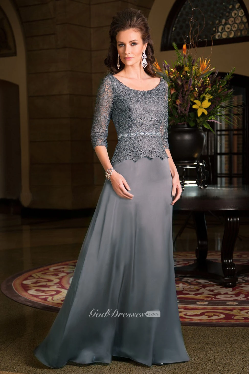 3-4 Sleeved Scoop-Neck Long Mother Of The Bride Dress With Lace Bodice