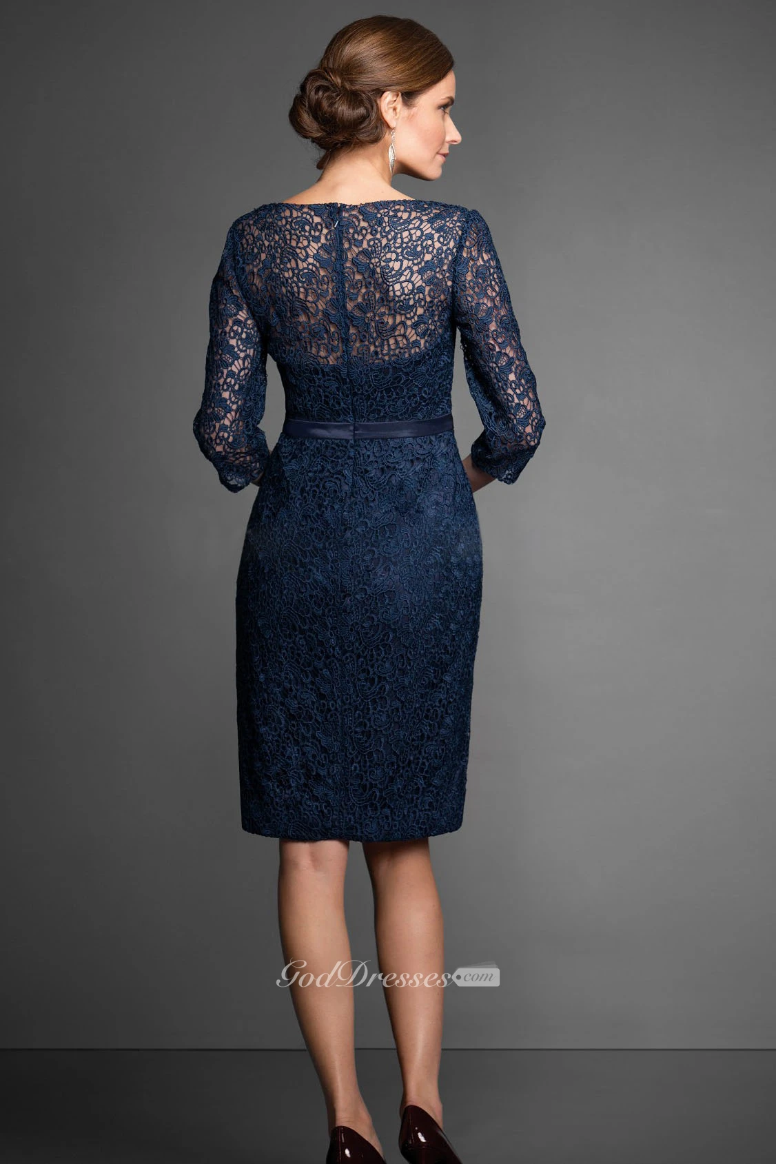 3-4 Sleeved V-Neck Knee-Length Lace Sheath Mother Of The Bride Dress With Illusion Detail