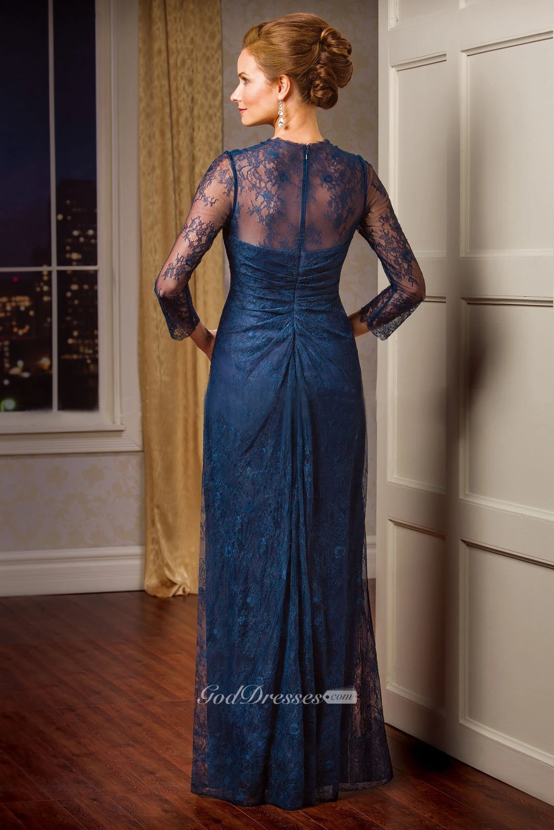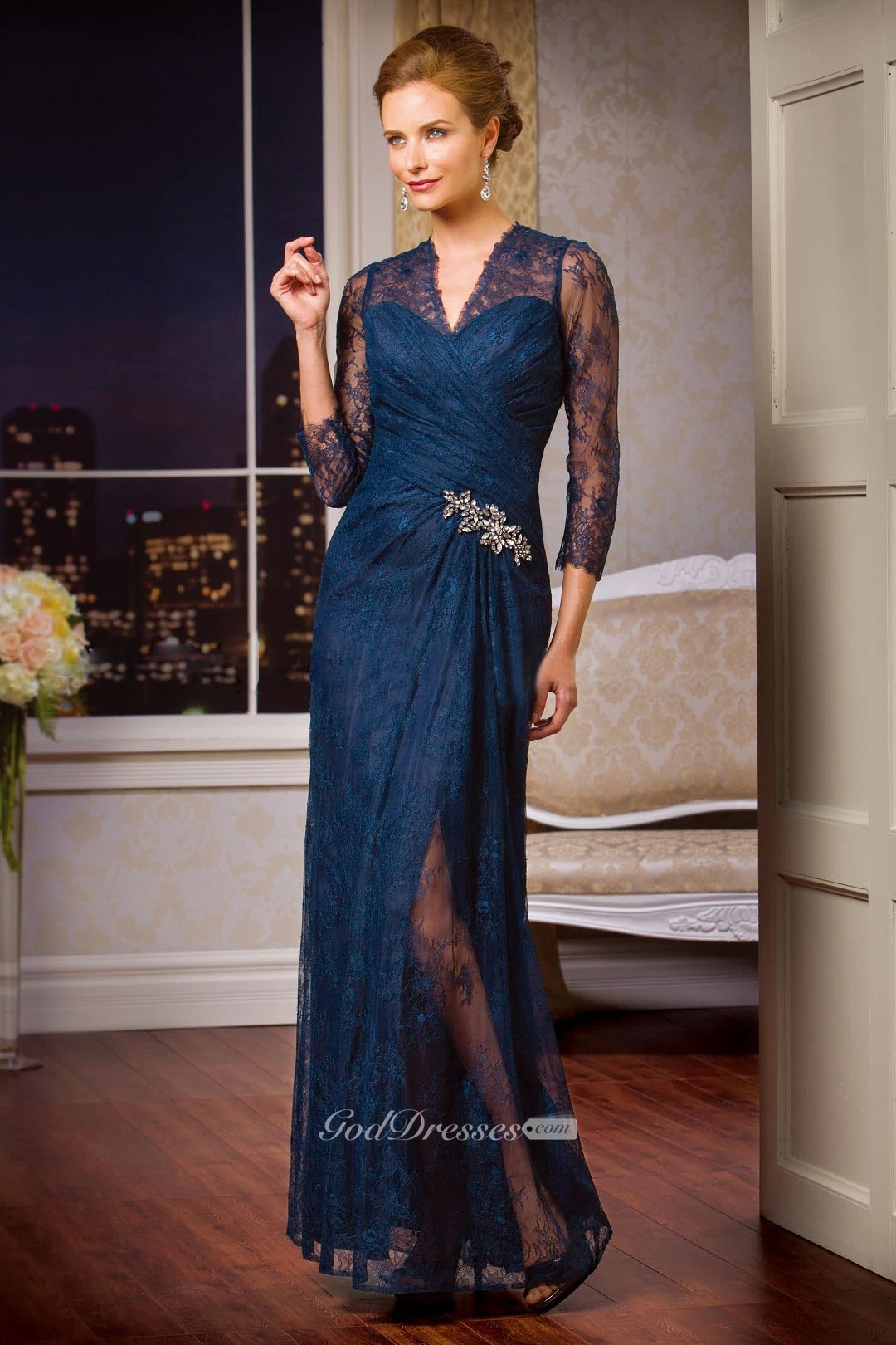 3-4 Sleeved V-Neck Lace Mother Of The Bride Dress With Crystals And Illusion Style