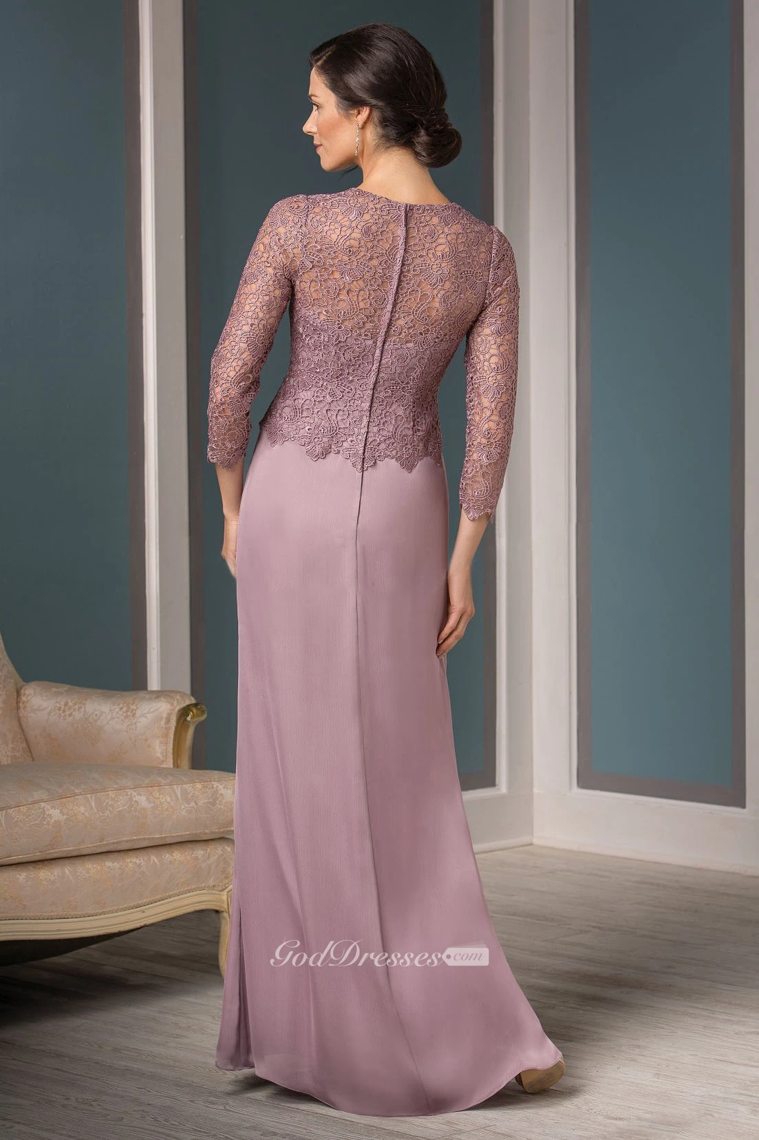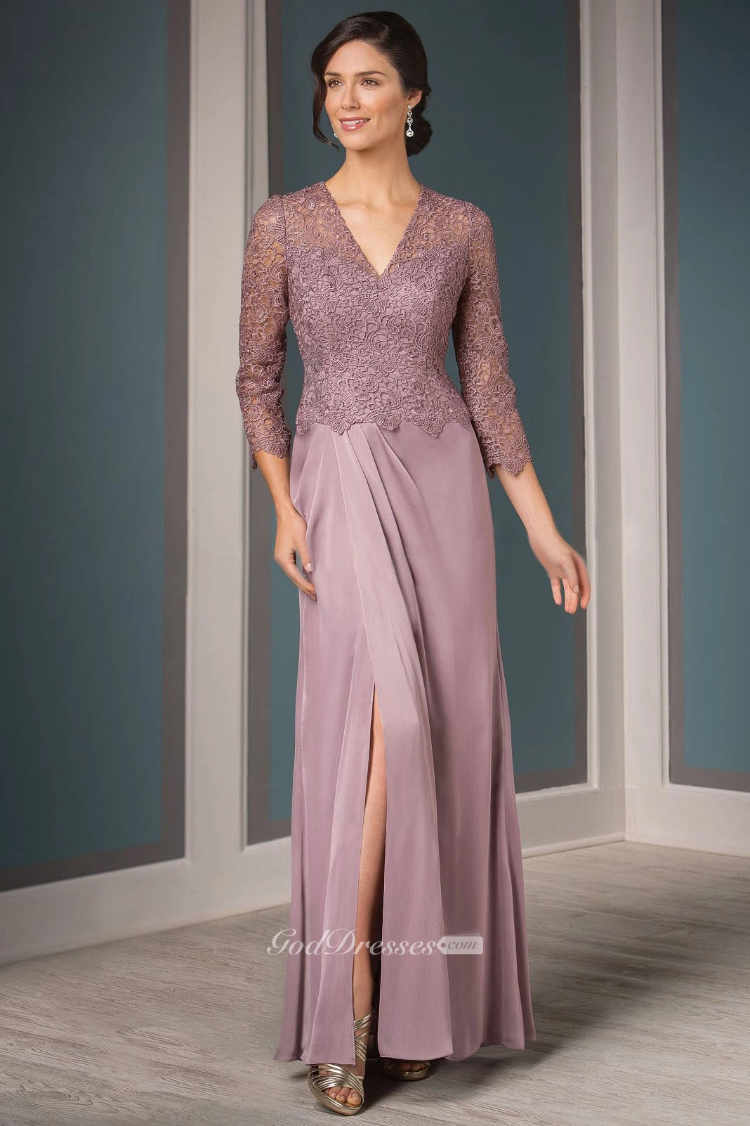 3-4 Sleeved V-Neck Mother Of The Bride Dress With Front Slit And Pleats