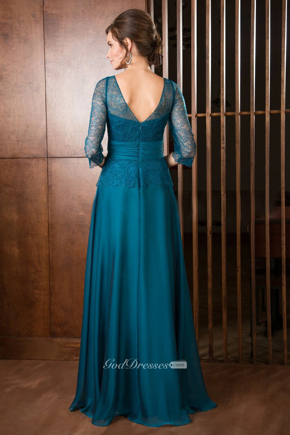 A-Line 3-4-Sleeve Maxi Scoop-Neck Lace Chiffon Mother Of The Bride Dress