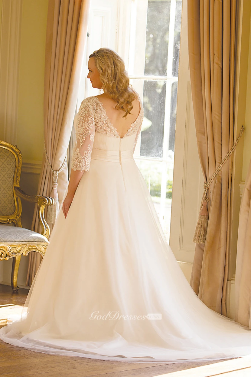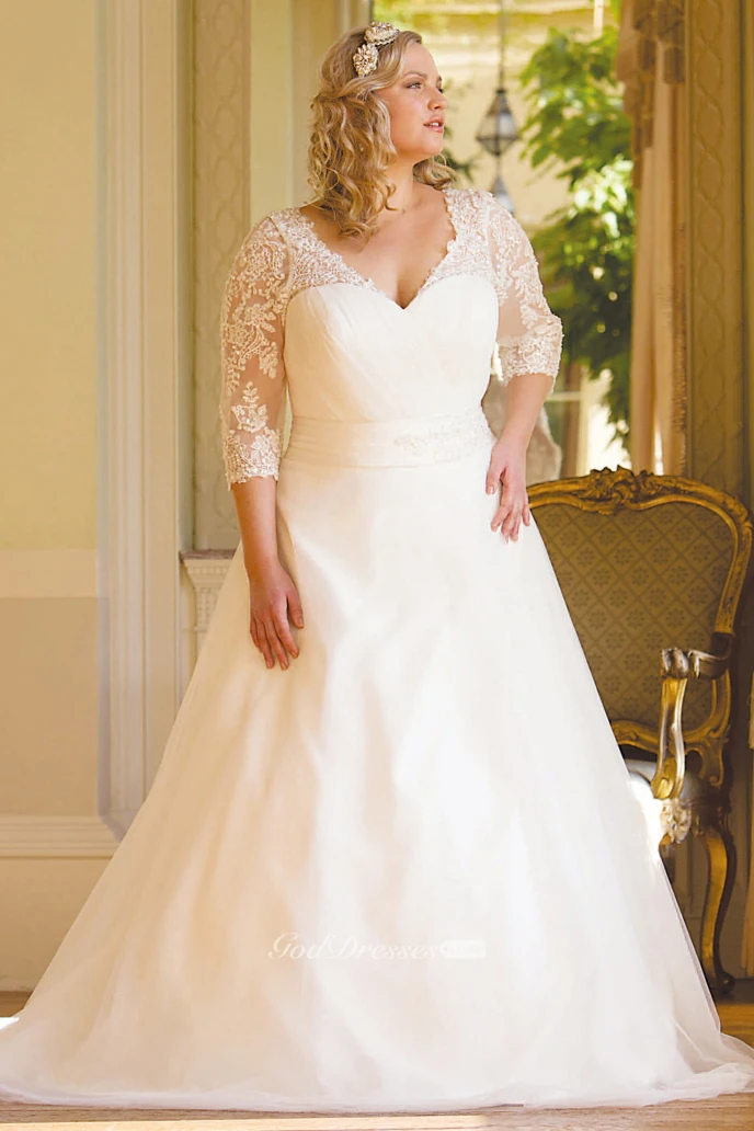 A-Line 3-4-Sleeve V-Neck Tulle Plus Size Wedding Dress