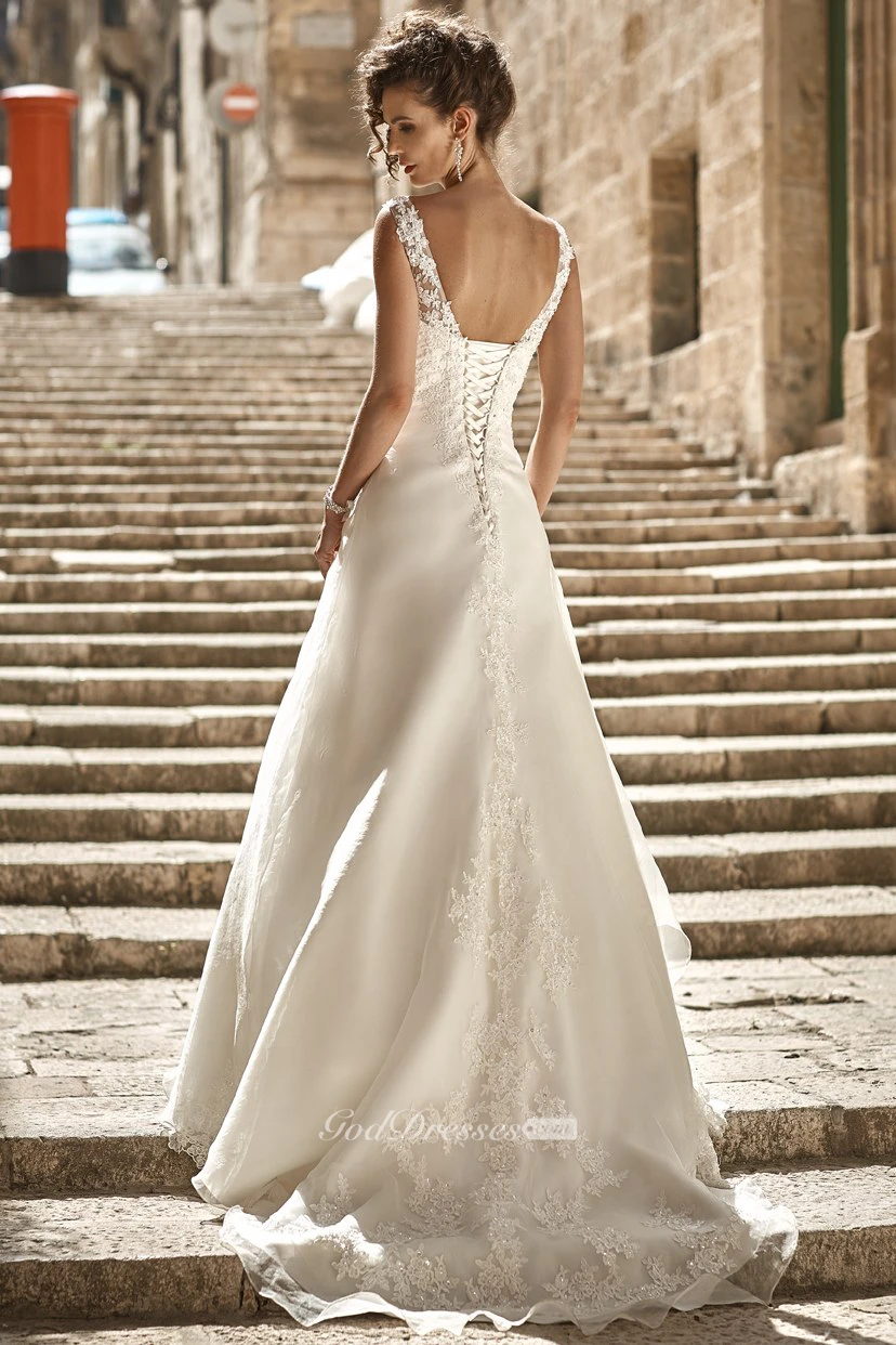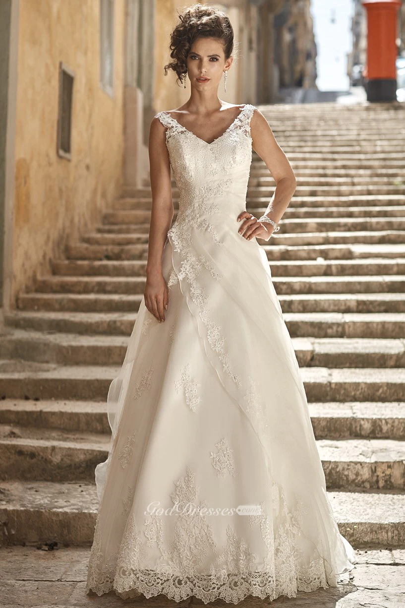 A-Line Appliqued V-Neck Long Sleeveless Satin&Lace Wedding Dress With Side Draping