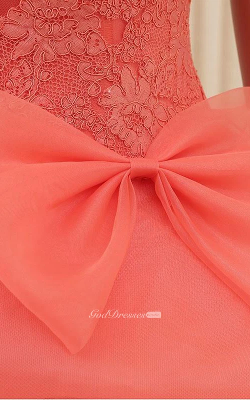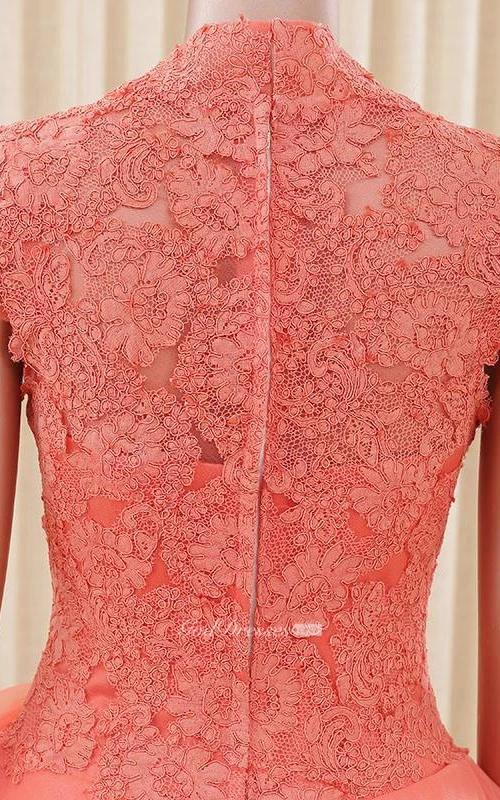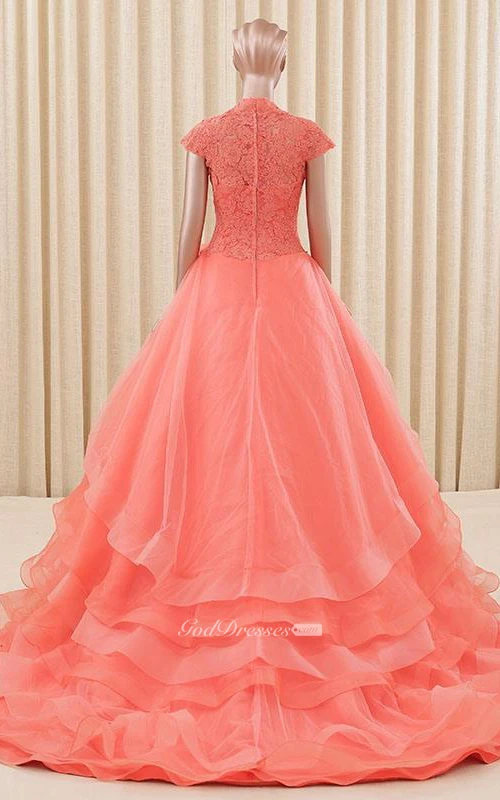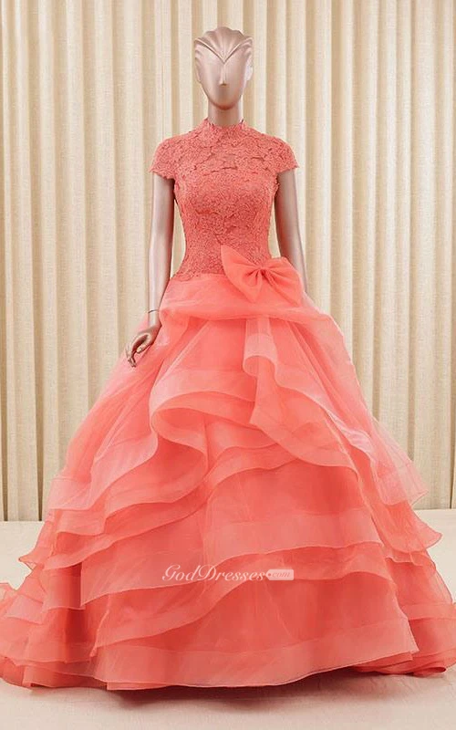 A-Line Ball Gown Floor-Length High Neck Bell Cap Bow Sweep Train Zipper Lace Organza Dress