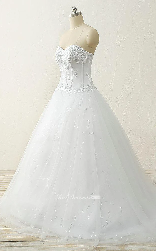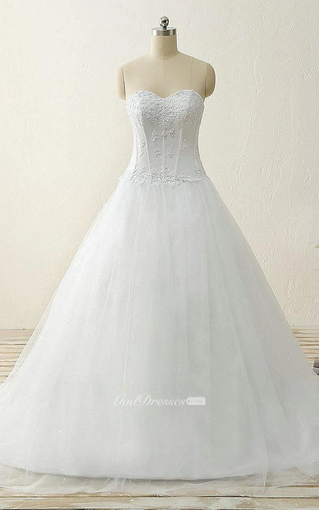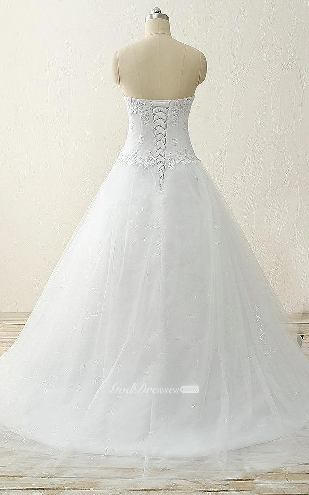 A-Line Ball Gown Floor-Length Straps Sweetheart Beading Appliques Sweep Train Corset Back Straps Tulle Lace Satin Dress