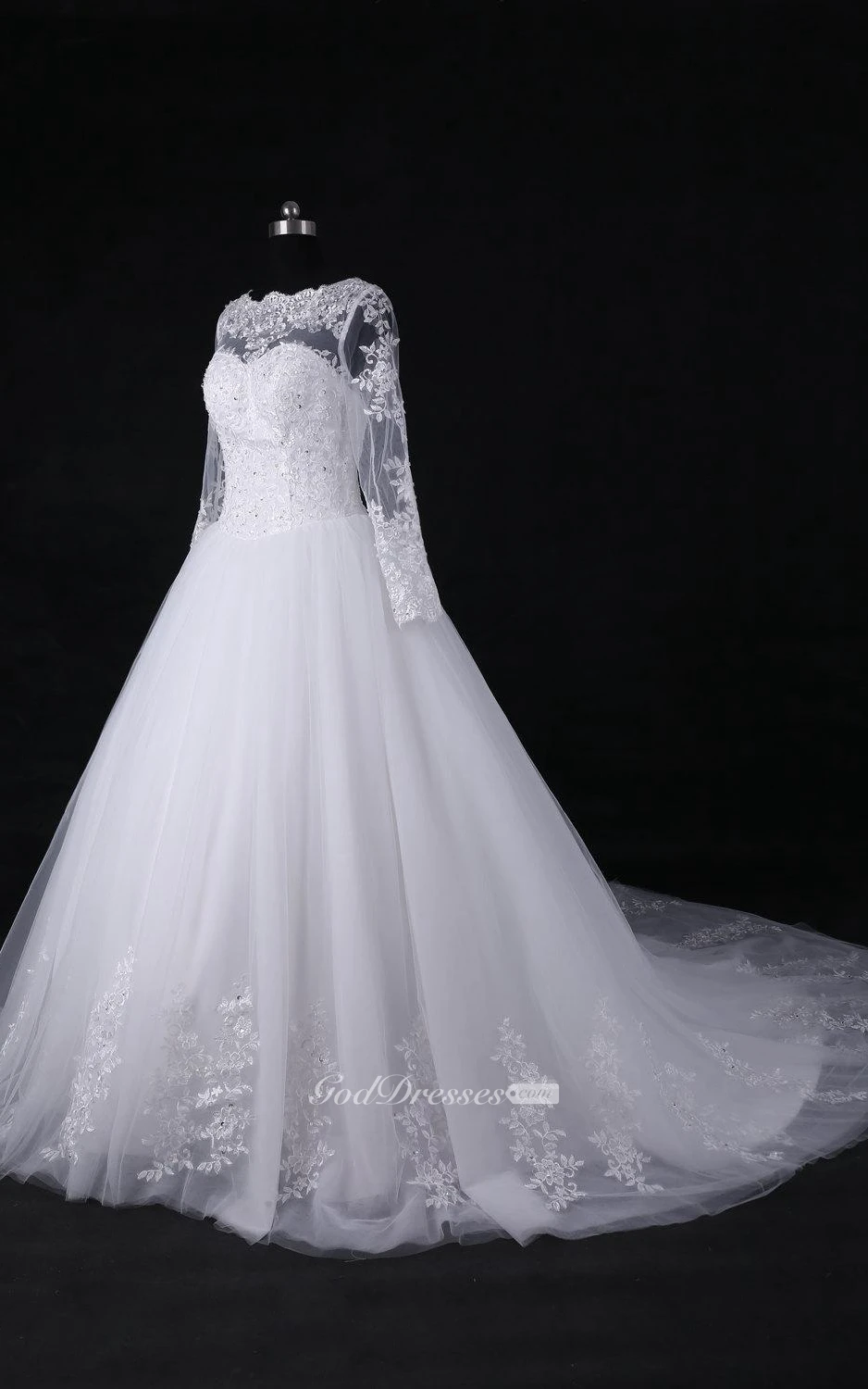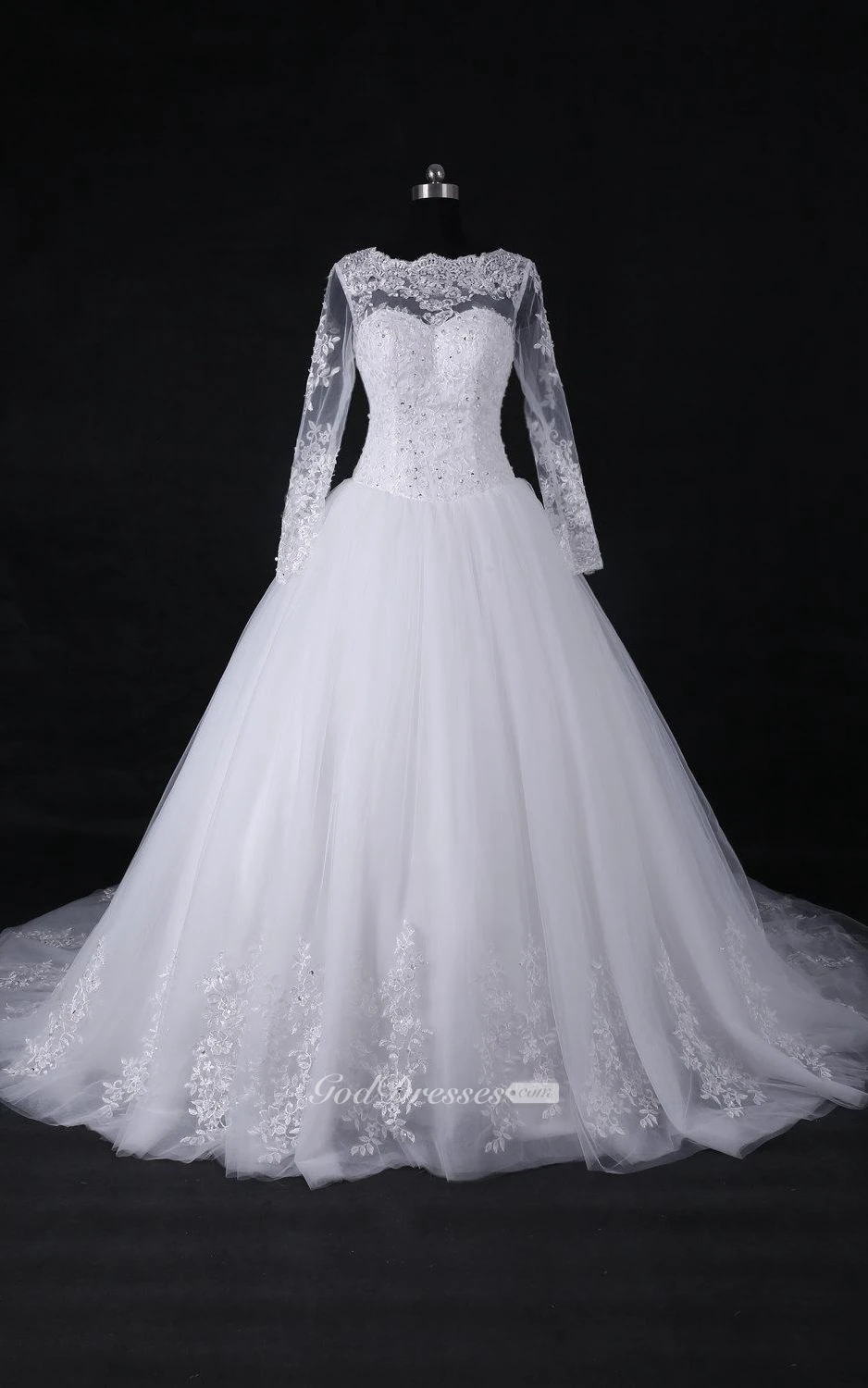 A-Line Ball Gown Long Sleeve Cathedral Train Tulle Lace Satin Dress
