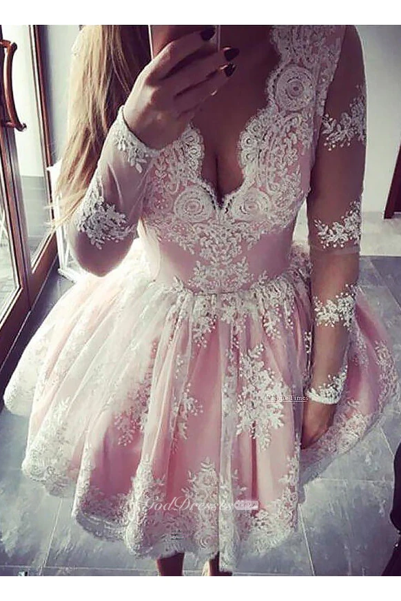 A-line Ball Gown Long Sleeve Lace Scalloped V-neck Zipper Short Mini Homecoming Dress