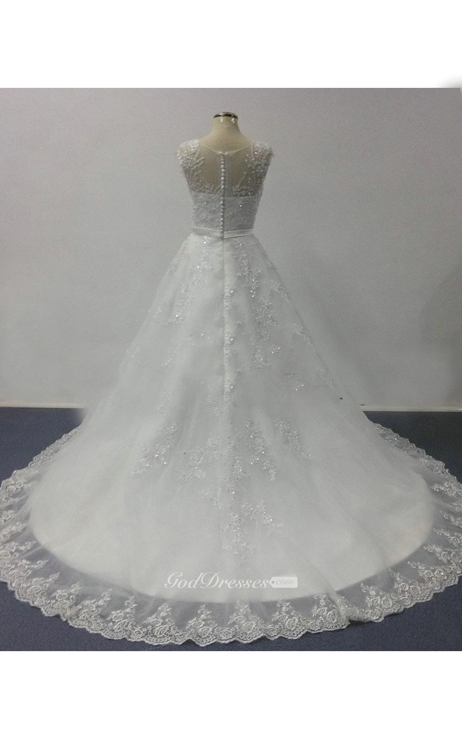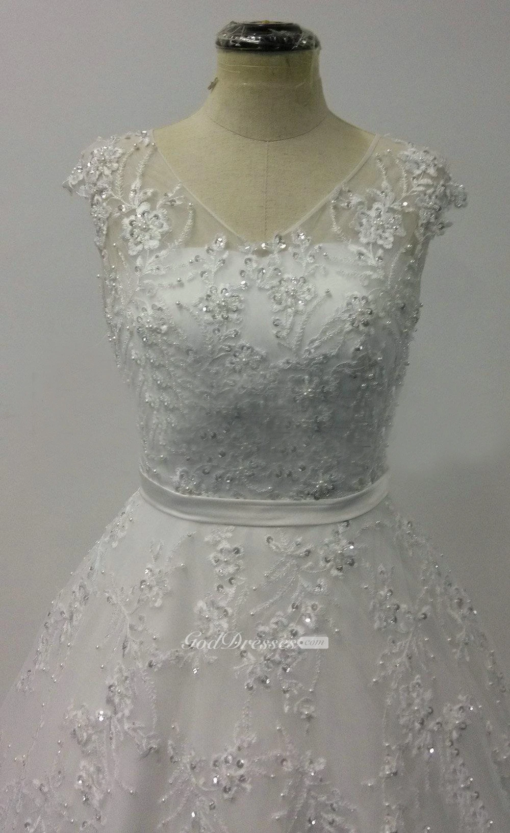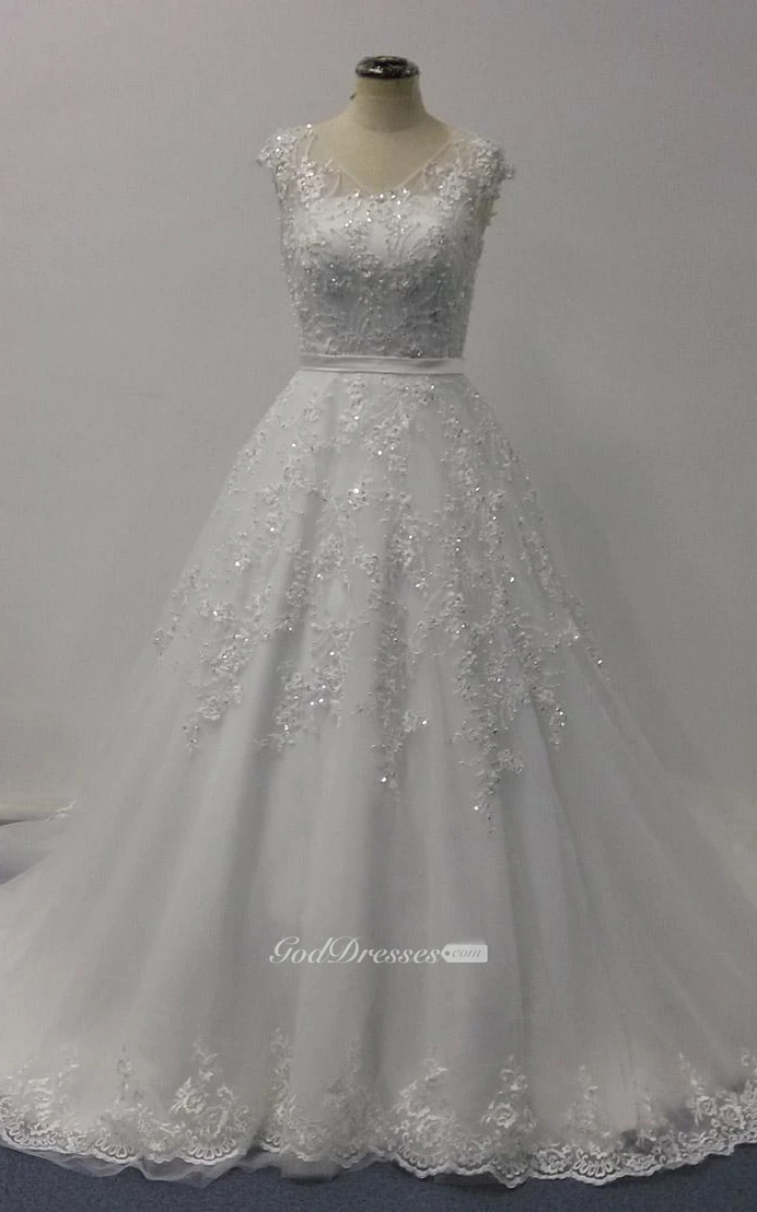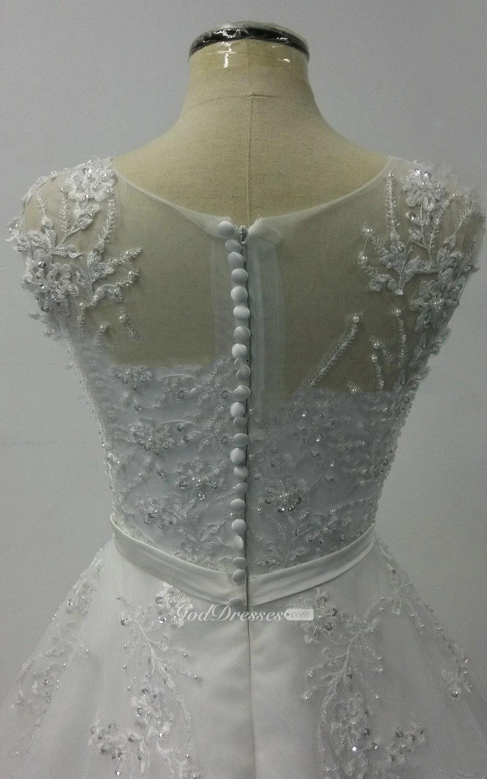 A-Line Ball Gown Short V-Neck Bell Cap Illusion Beading Appliques Sash Illusion Chapel Train Button Zipper Illusion Tulle Lace Sequins Satin Dress