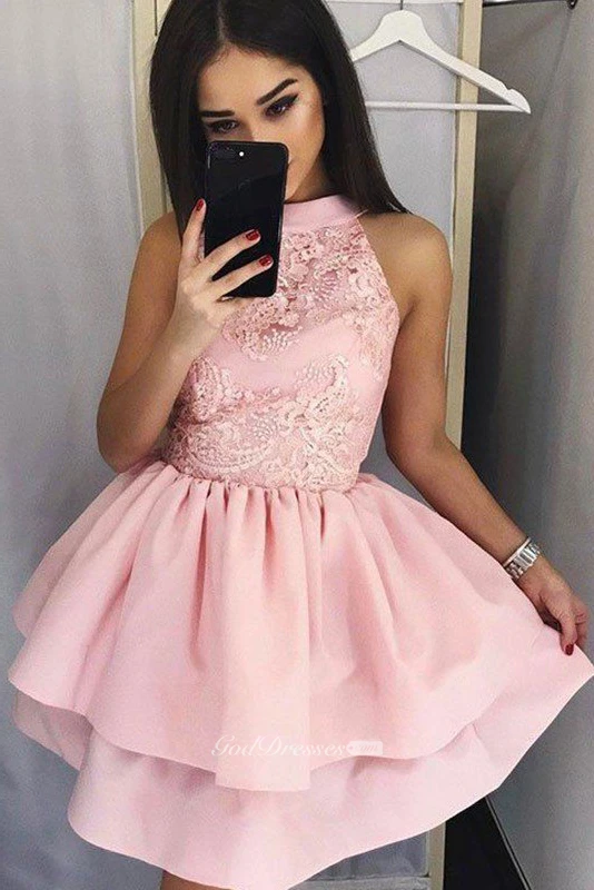 A-line Ball Gown Sleeveless Satin Lace High Neck Short Mini Homecoming Dress