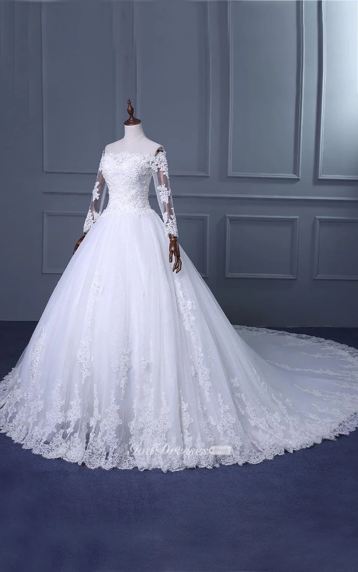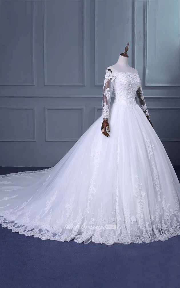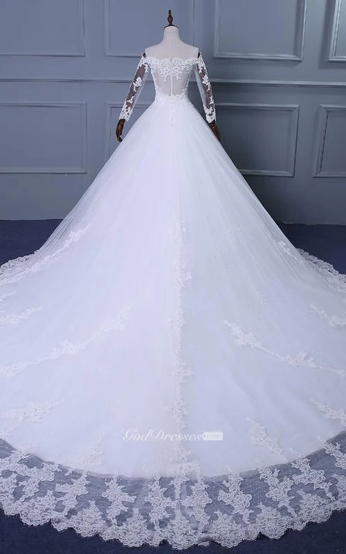 A-Line Ball Gown Tea-Length Off-The-Shoulder One-Shoulder Straps Long Sleeve Beading Appliques Brush Train Straps Tulle Lace Sequins Satin Dress