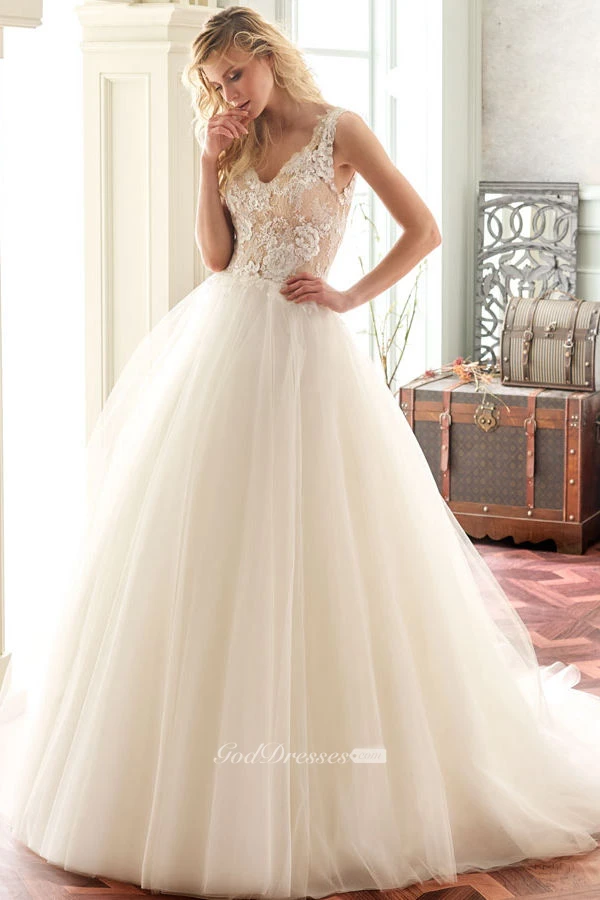 A-Line Ball-Gown V-Neck Appliqued Sleeveless Floor-Length Tulle Wedding Dress With Illusion Back And Court Train