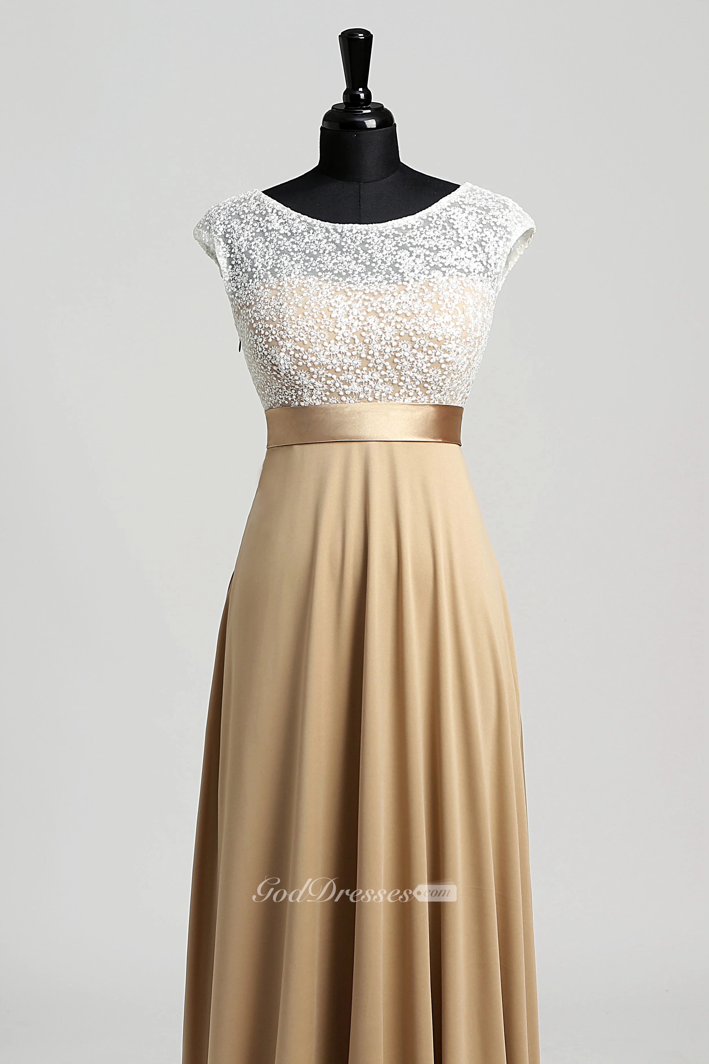 A-line Bateau Cap Short Sleeve Floor-length Jersey Lace Dress