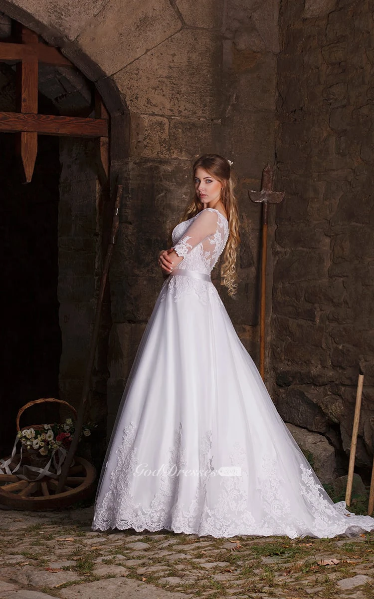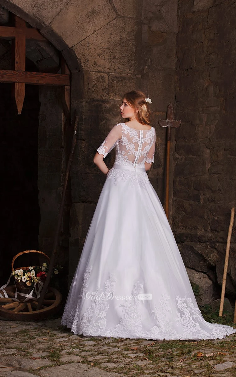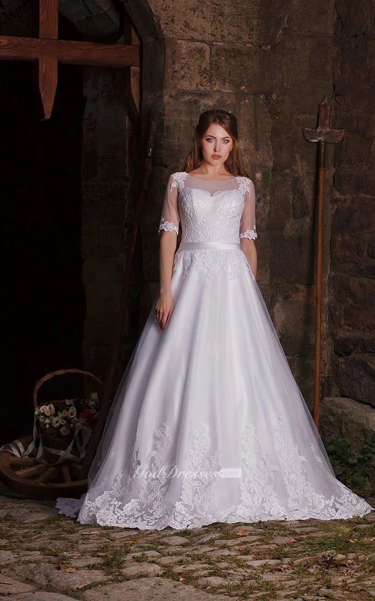 A-line Bateau Half Sleeve Illusion Back Appliques Floor-length Dress