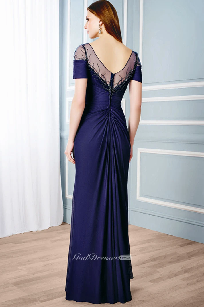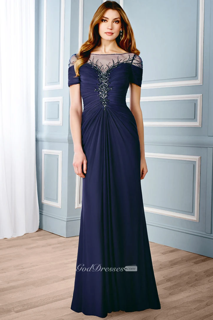 A-Line Bateau Short-Sleeve Beaded Maxi Chiffon Formal Dress With Low-V Back And Ruching