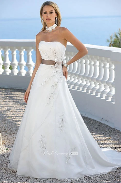 A-Line Beaded Strapless Satin&Tulle Wedding Dress With Flower And Ribbon