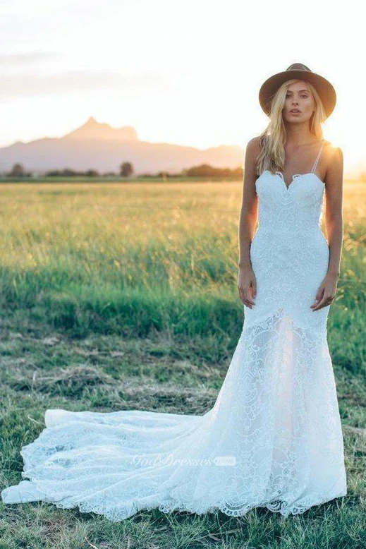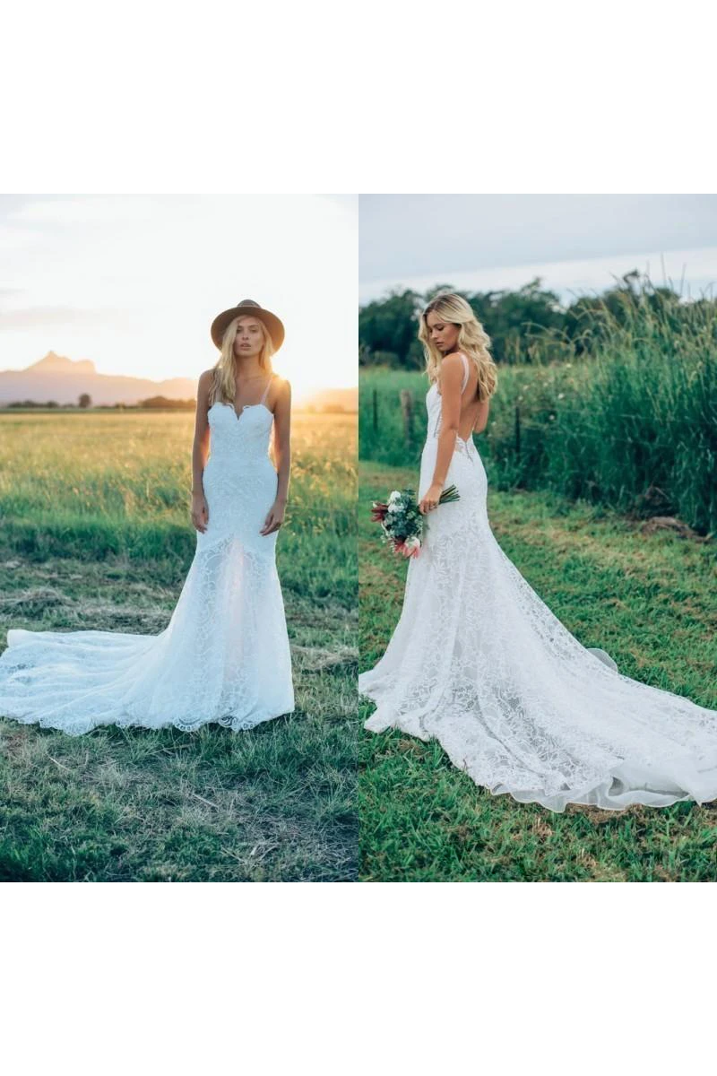 A Line Bohemian Low V Back Full Lace Beach Garden Bridal Gowns