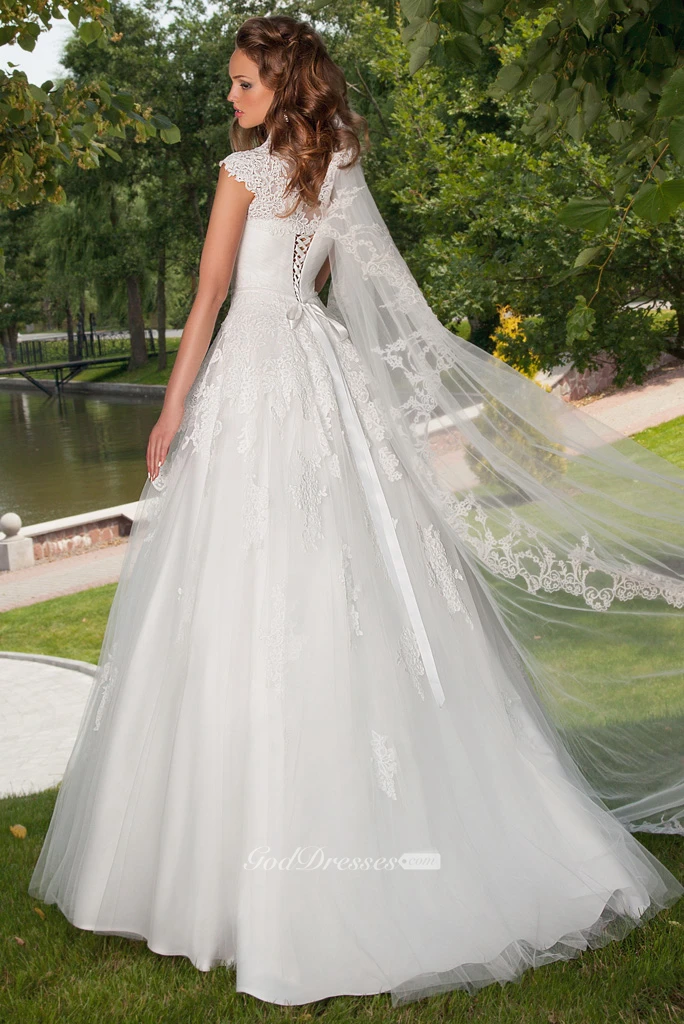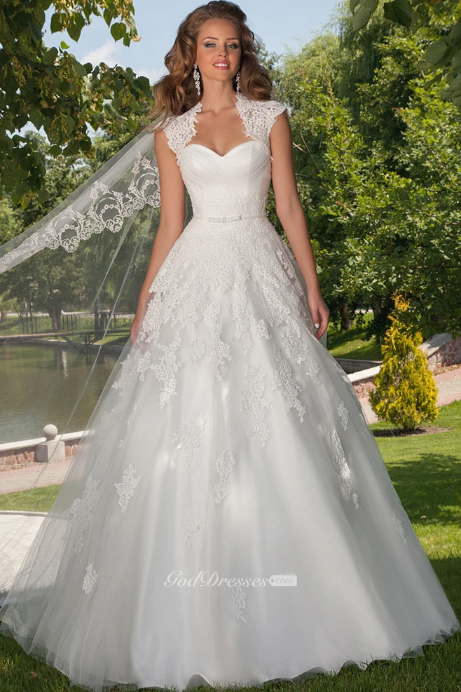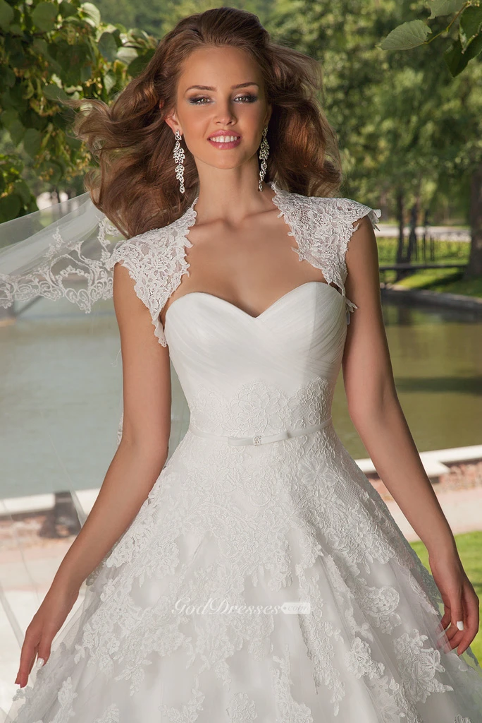 A-Line Cap-Sleeve Floor-Length Ruched Sweetheart Tulle Wedding Dress With Appliques And Cape