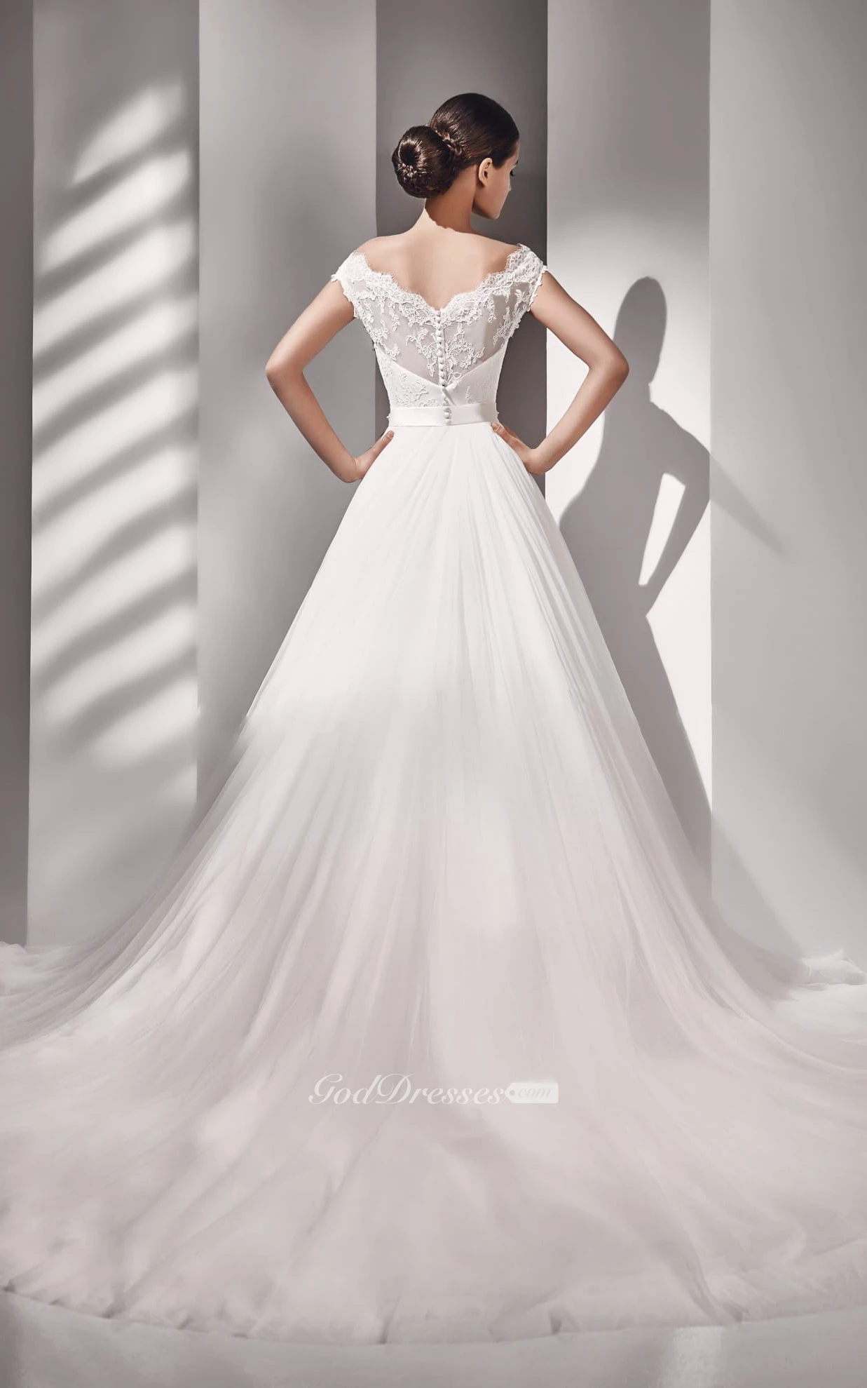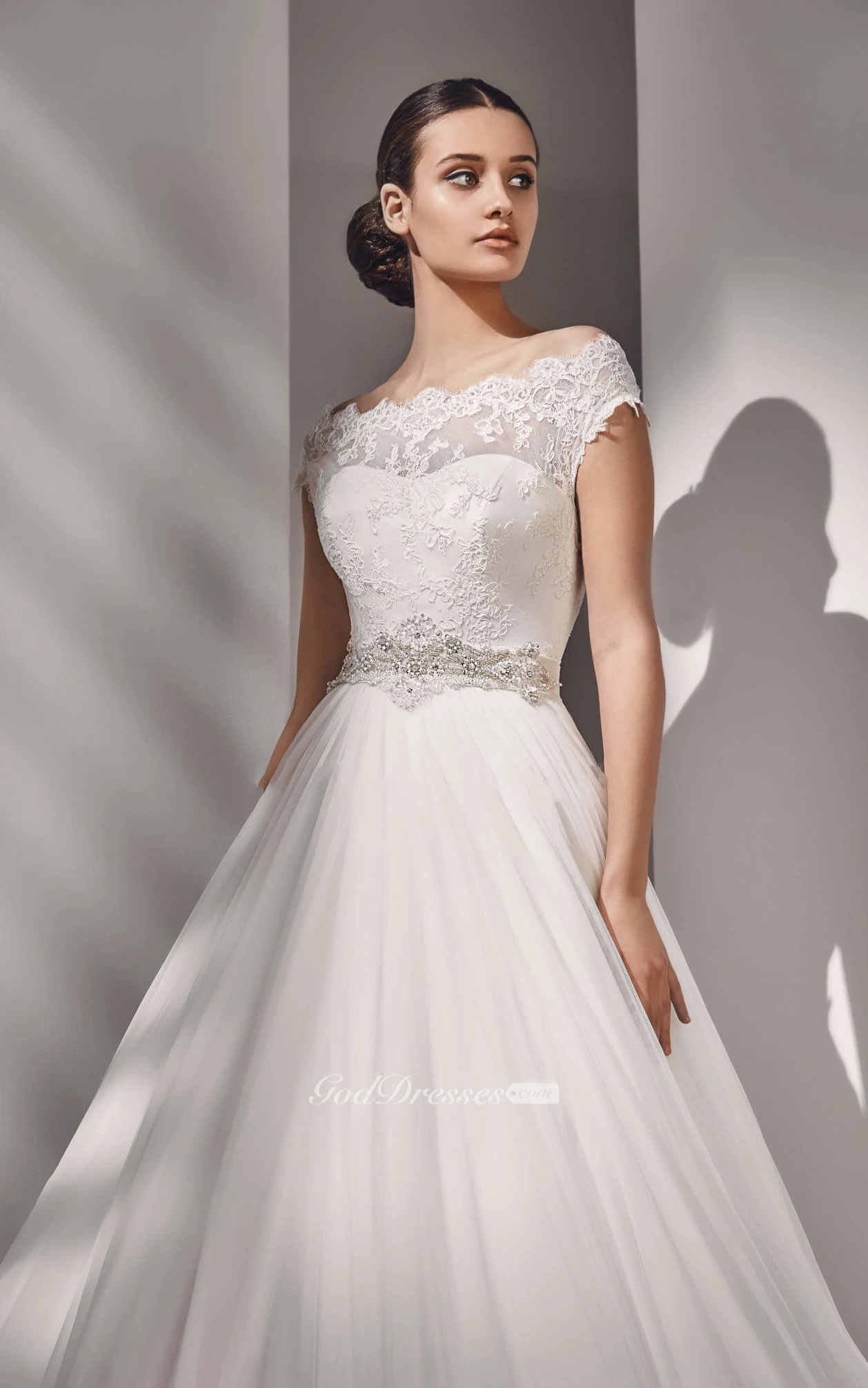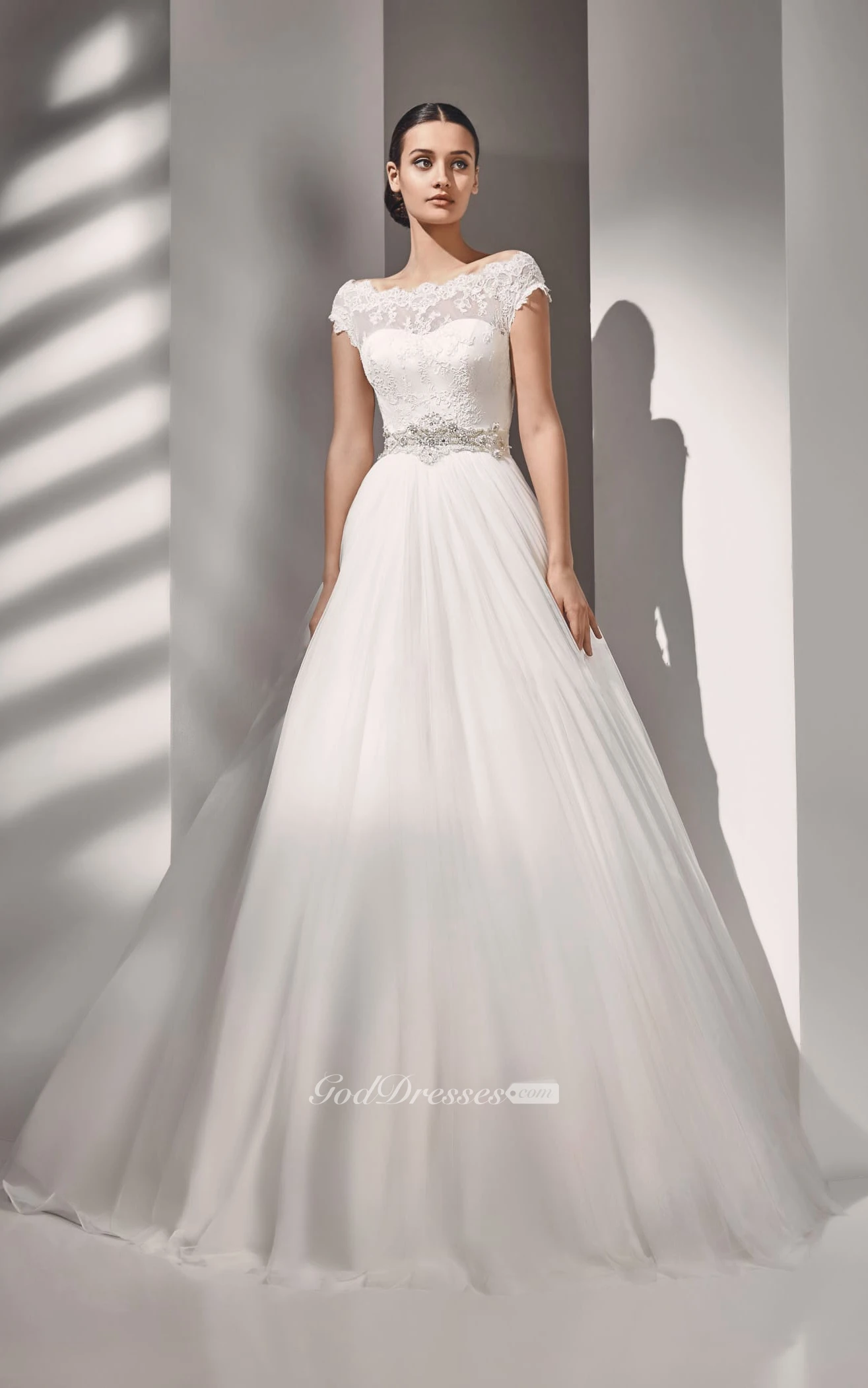A-line Cap Sleeve Scalloped Neckline Button Back Lace Top Dress With Crystal Detailing