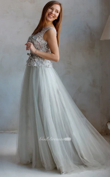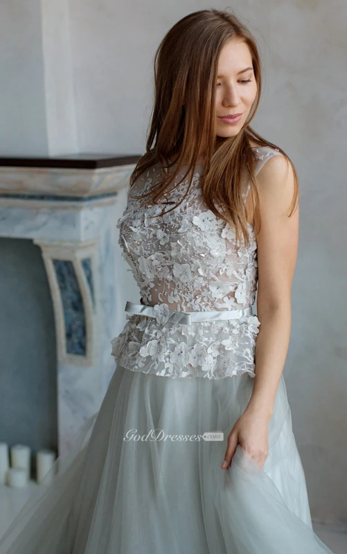 A-Line Court Train Jewel Short Sleeve Tulle Lace Pleats Low-V Back Dress