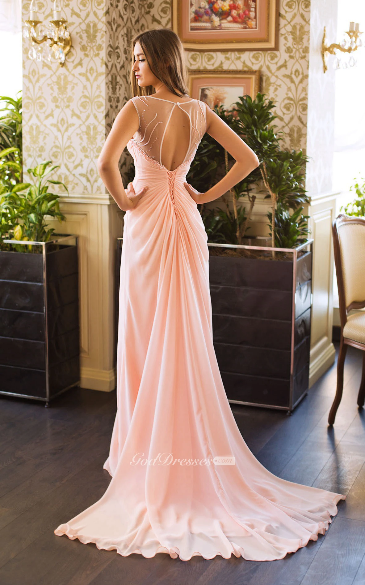 A-Line Court Train V-Neck Sleeveless Chiffon Beading Pleats Keyhole Dress