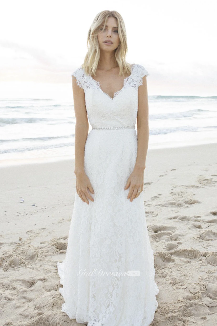A-line Elegant Bohemian Lace Cap Sleeve Bridal Gown With V-neck And Keyhole