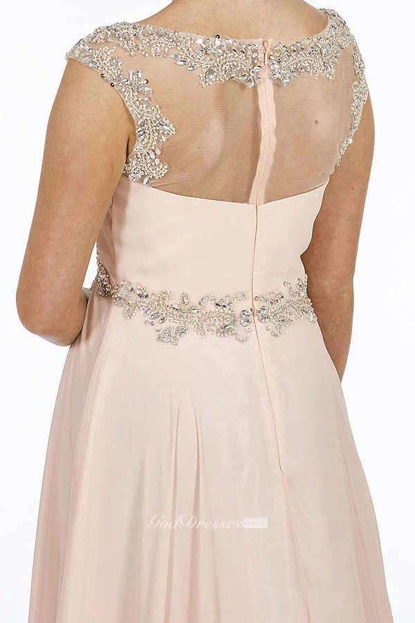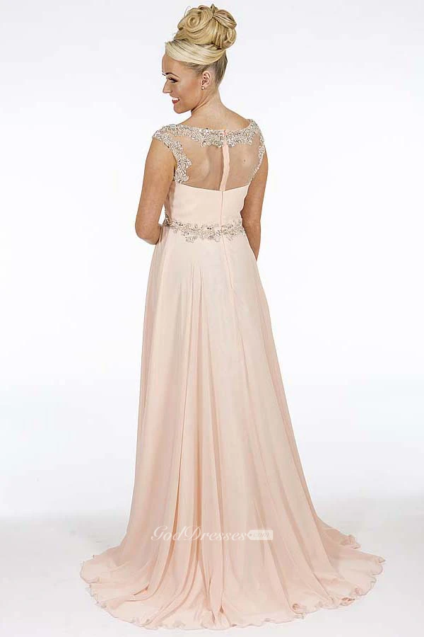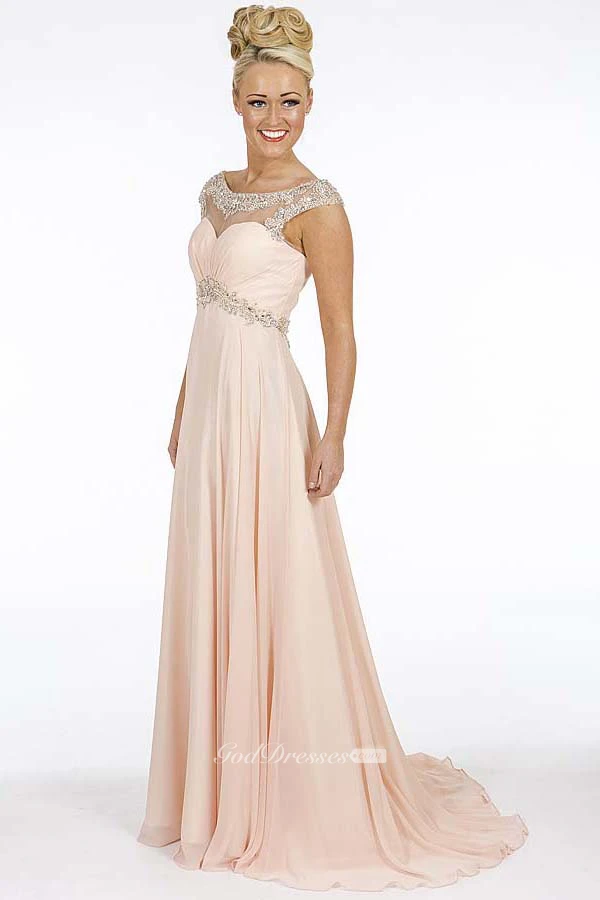 A-Line Empire Scoop Floor-Length Cap-Sleeve Beaded Chiffon Prom Dress With Waist Jewellery And Ruching
