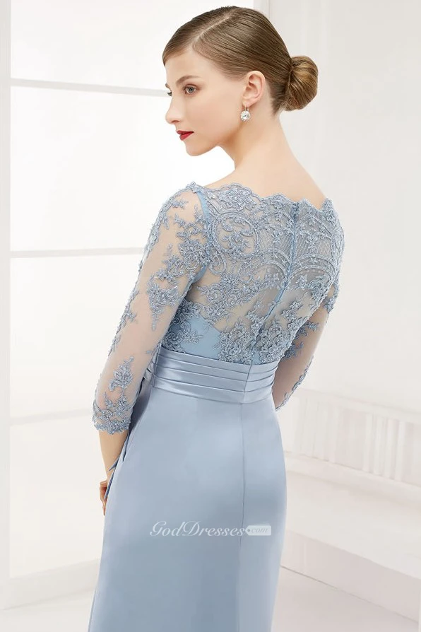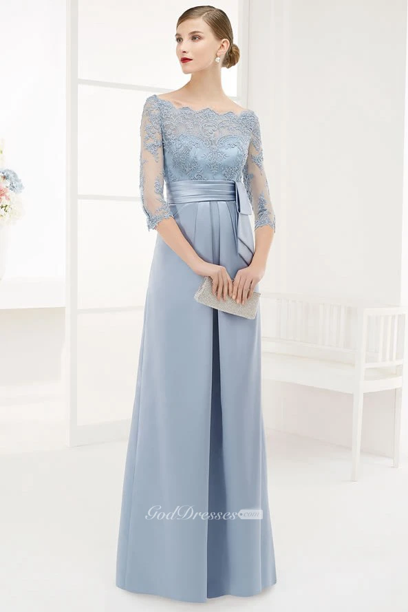 A-Line Floor-Length Appliqued Bateau-Neck 3-4-Sleeve Satin Prom Dress With Beading