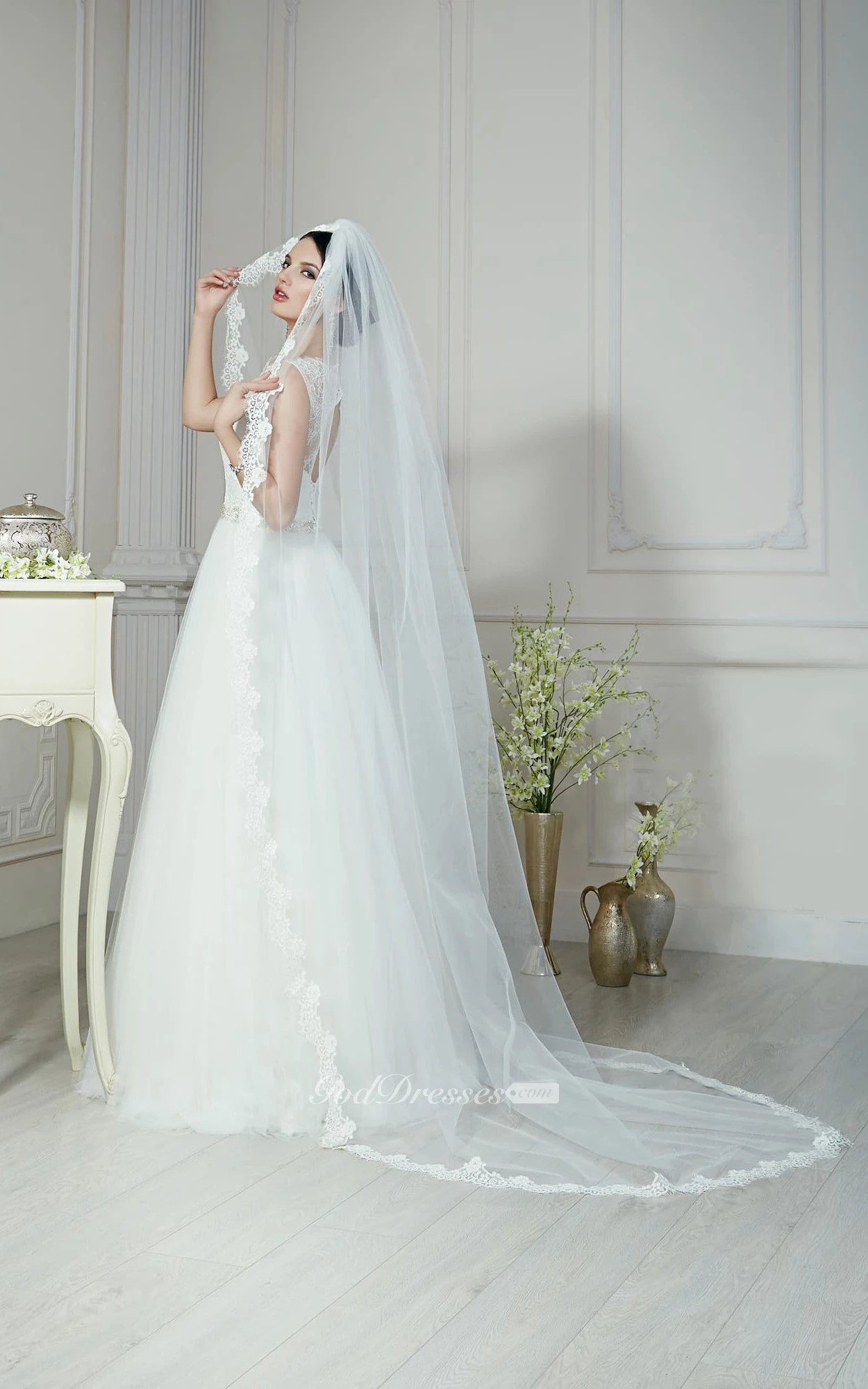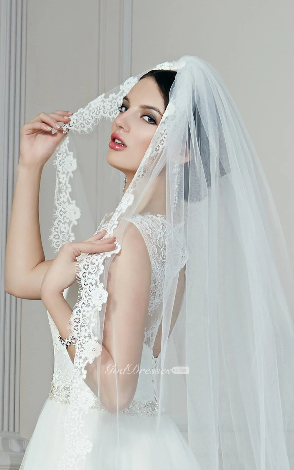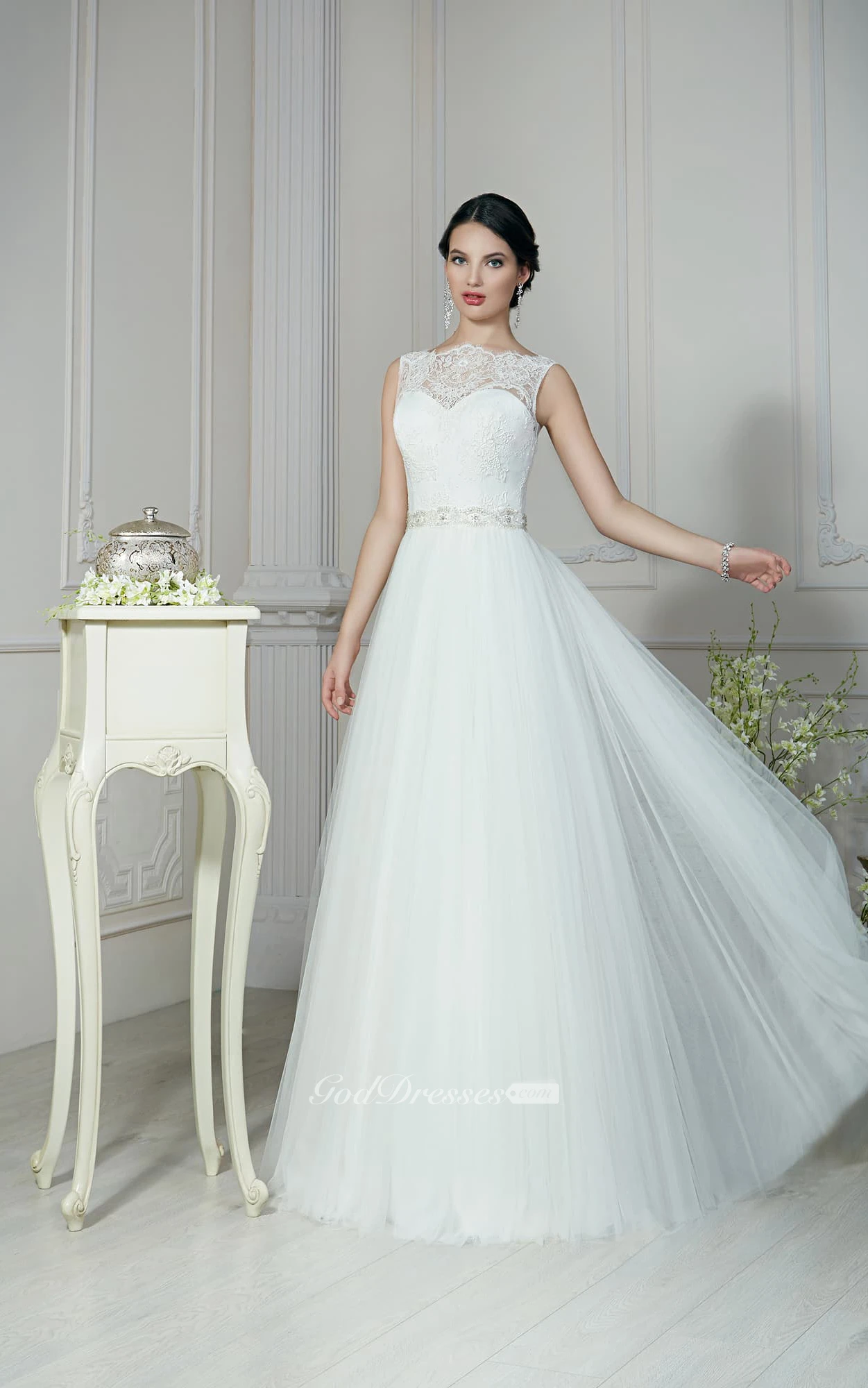 A-Line Floor-Length Bateau-Neck Sleeveless Keyhole Tulle Dress With Beading And Pleatings