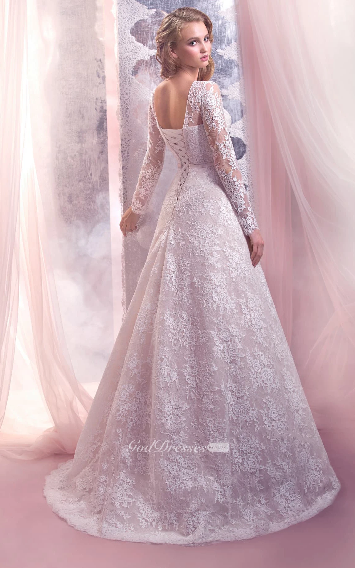 A-Line Floor-Length Bateau-Neck T-Shirt-Sleeve Corset-Back Lace Dress