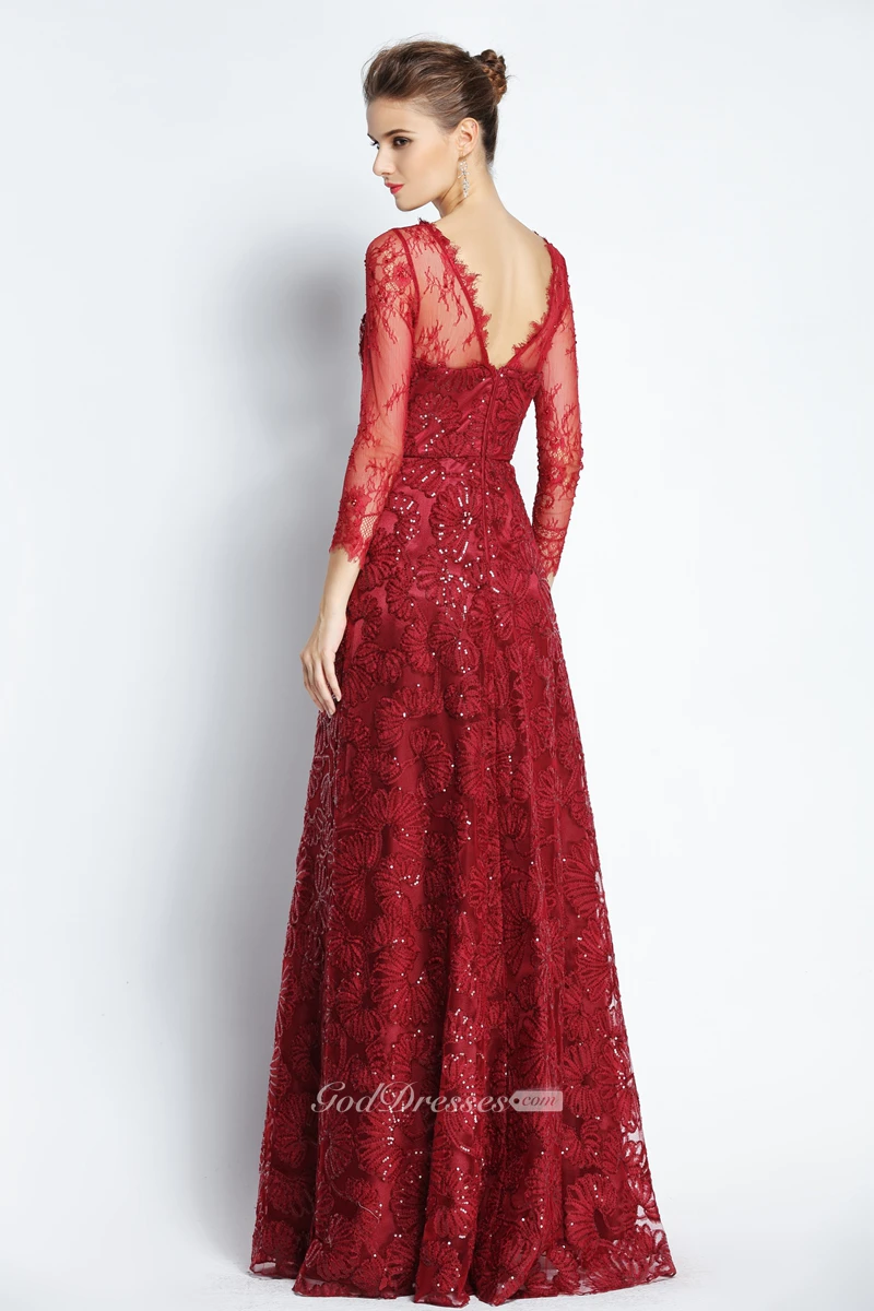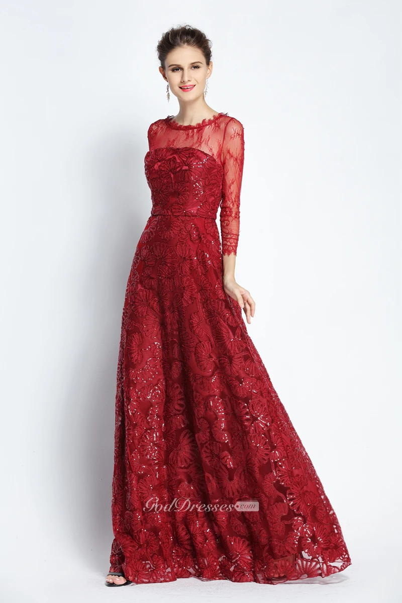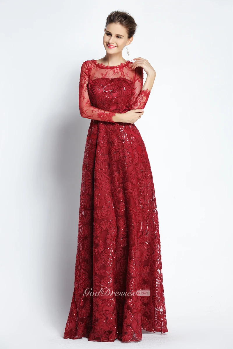 A-Line Floor-length Bateau Scalloped Lace Long Sleeve Prom Dress with Sequins