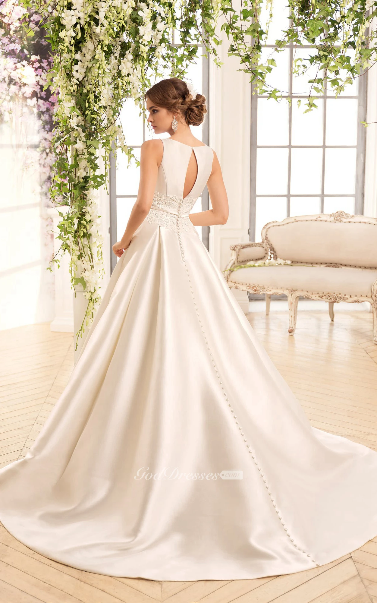 A-Line Floor-Length Bateau Sleeveless Keyhole Satin Dress