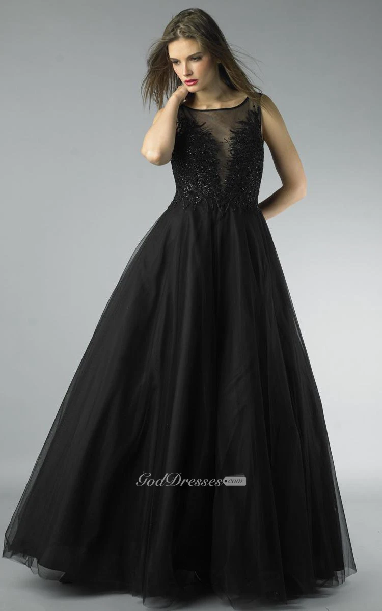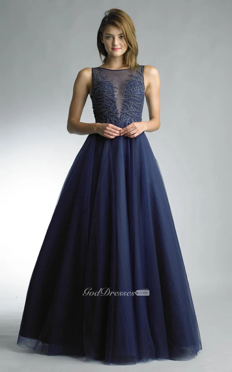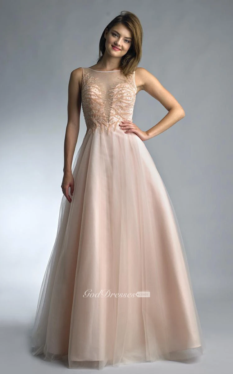 A-line Floor-length Bateau Sleeveless Tulle Low-V Back Dress