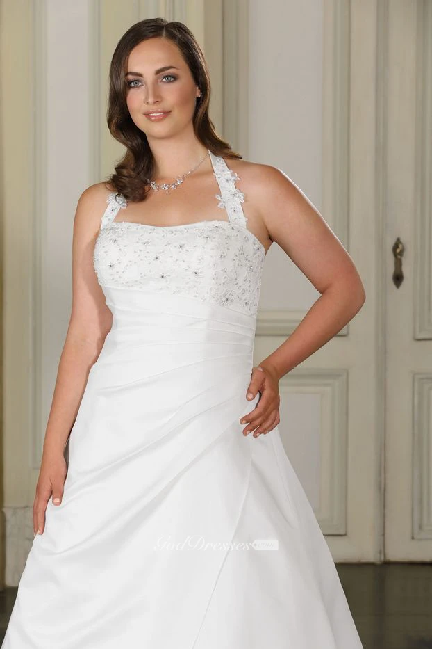 A-Line Floor-Length Halter Sleeveless Satin Sweep Train Side Draping Dress