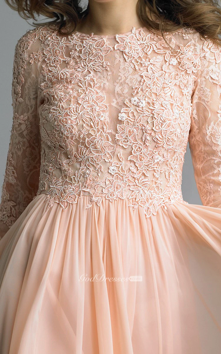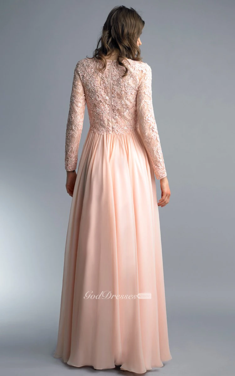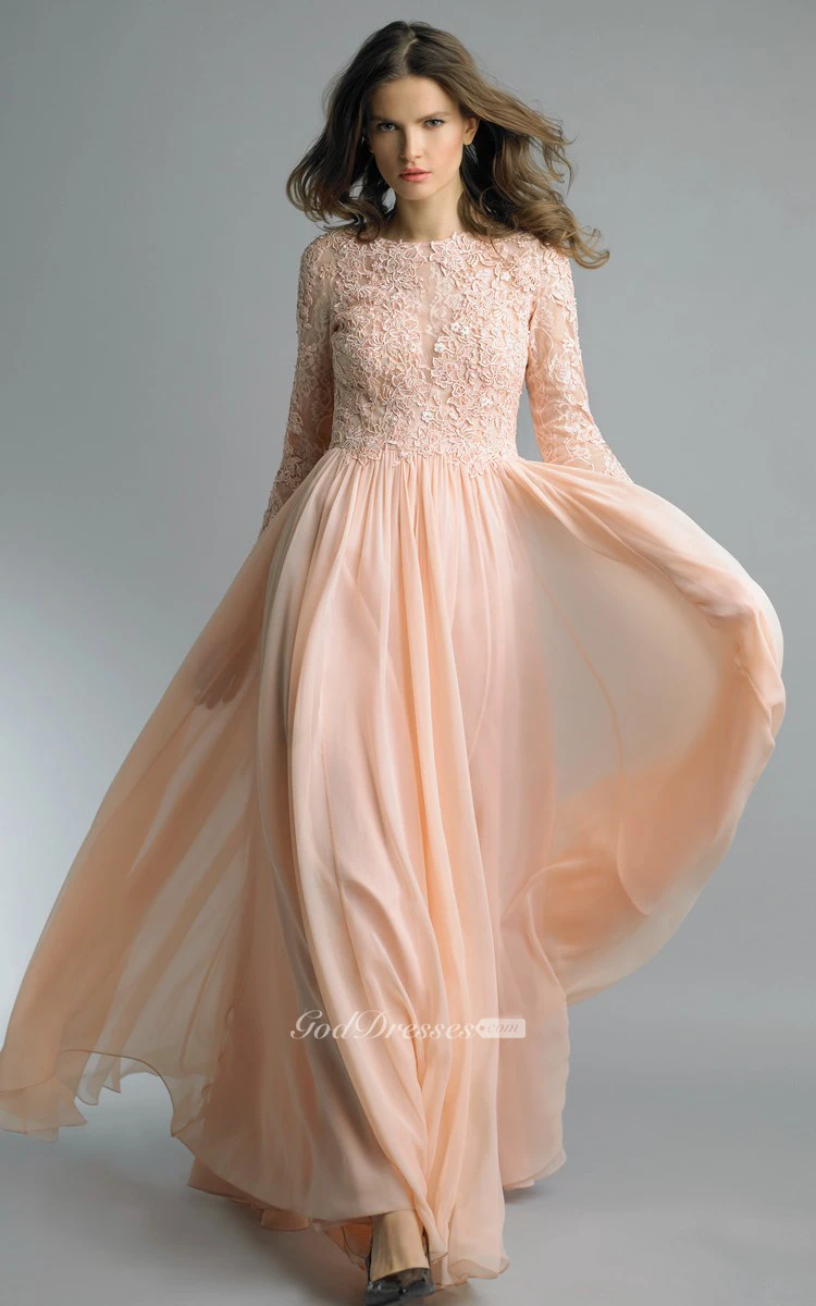 A-line Floor-length High Neck Long Sleeve Chiffon Zipper Dress