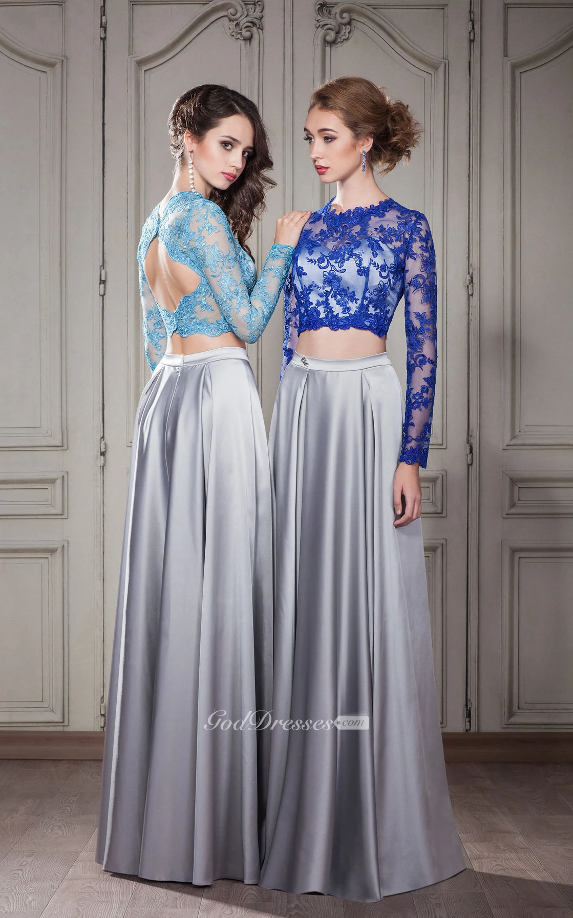 A-Line Floor-Length High-Neck Long Sleeve Satin Pleats Lace Keyhole Dress