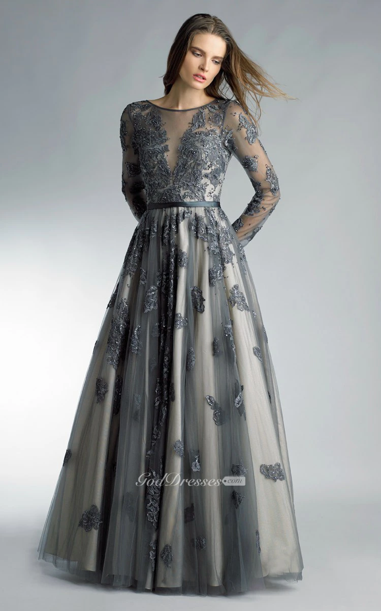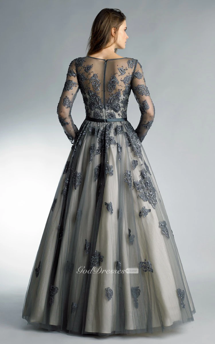A-line Floor-length High Neck Long Sleeve Tulle Zipper Dress