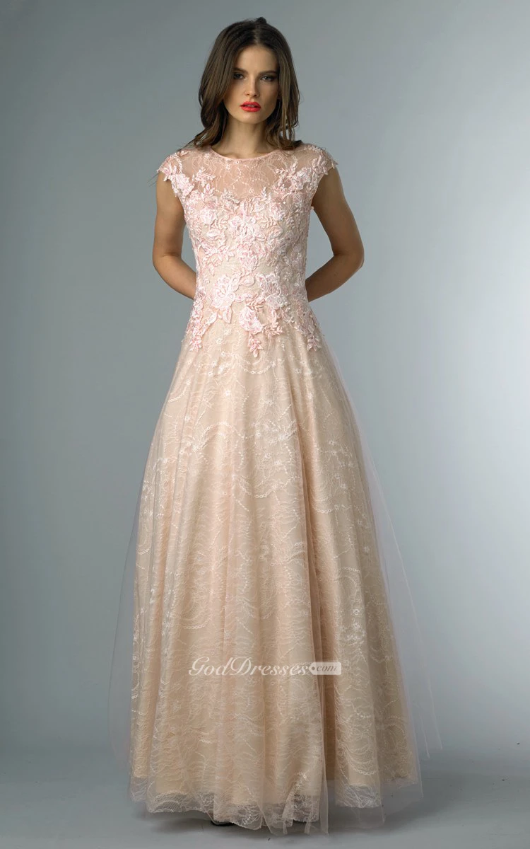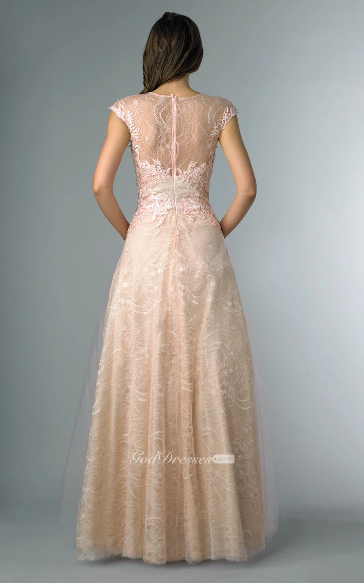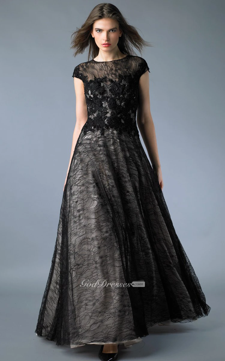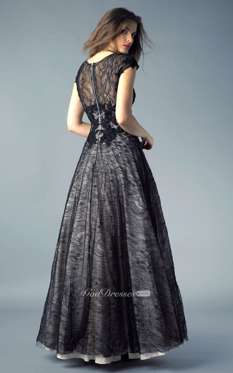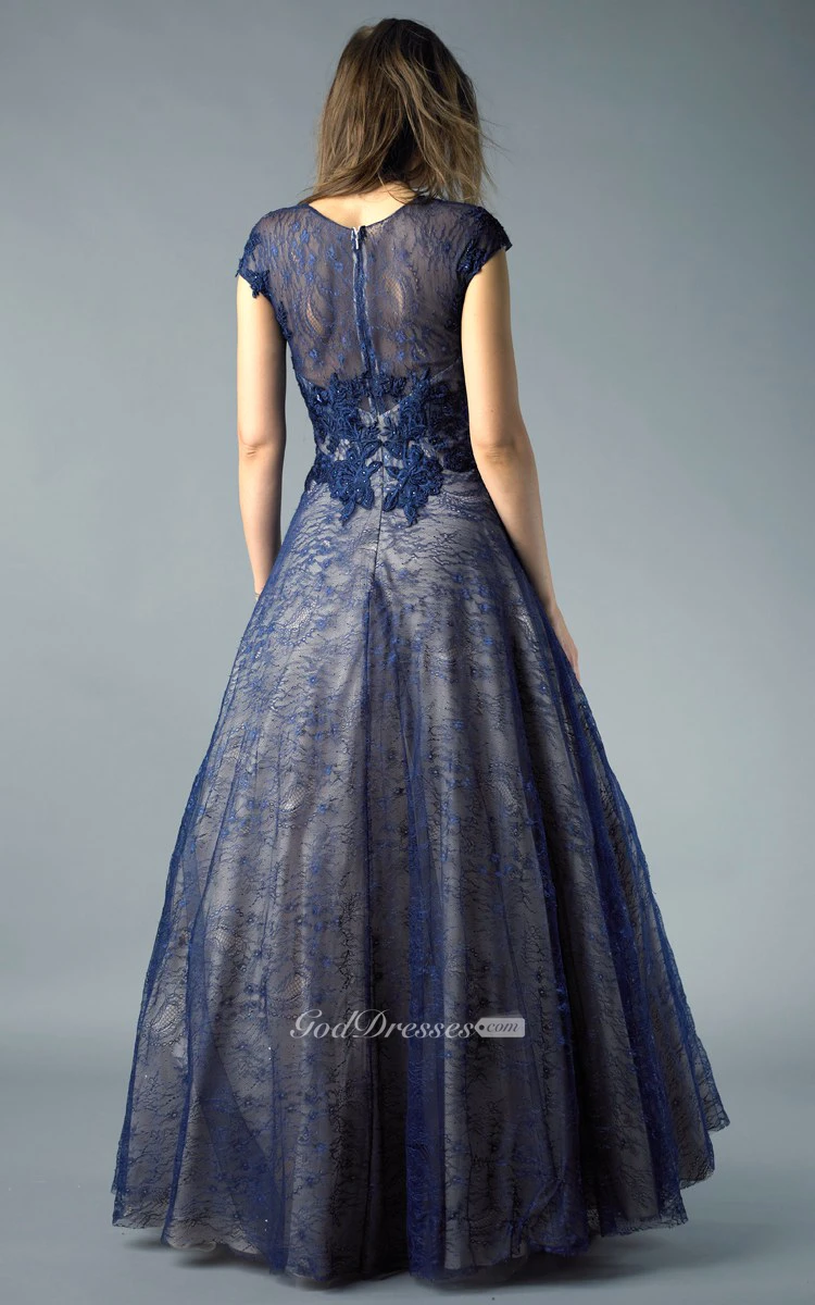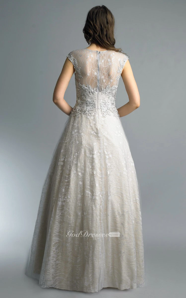 A-line Floor-length High Neck Short Sleeve Lace Illusion Dress