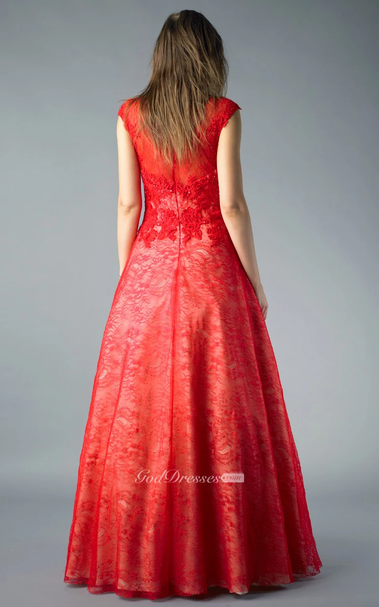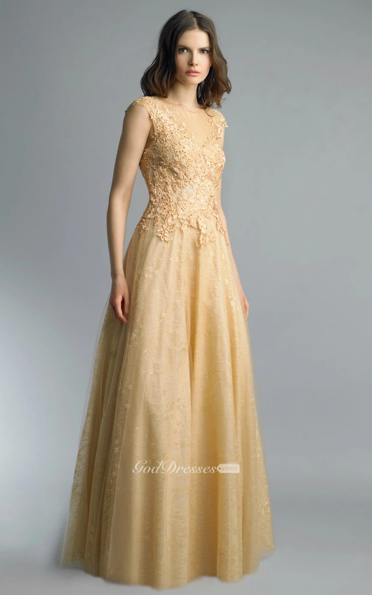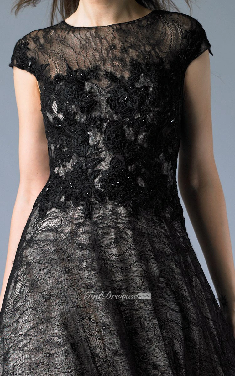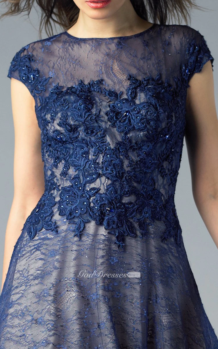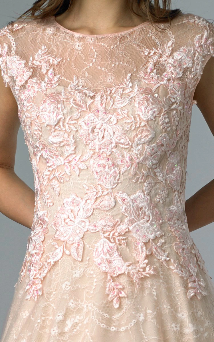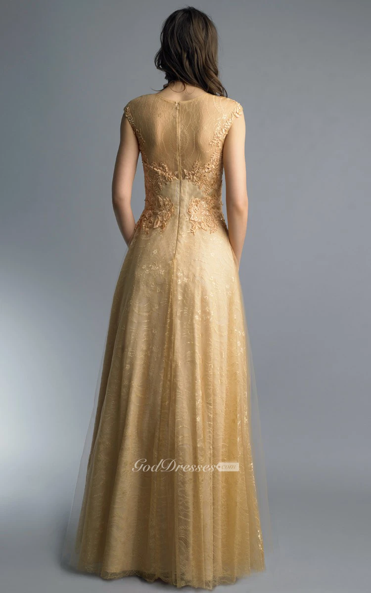 A-line Floor-length High Neck Short Sleeve Lace Illusion Dress