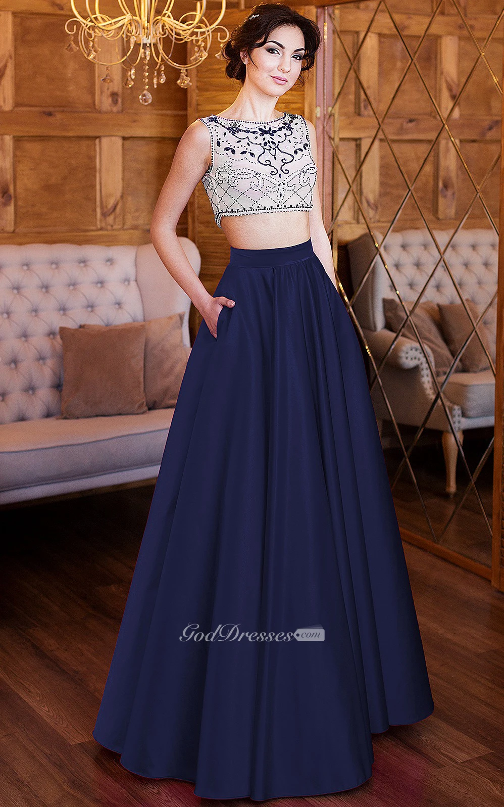 A-Line Floor-Length High-Neck Short Sleeve Satin Pleats Beading Button Dress