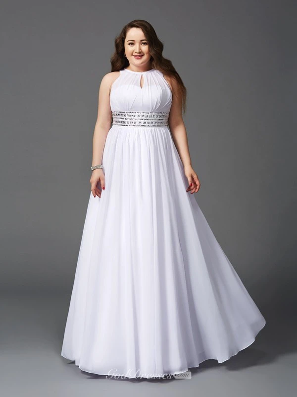 A-line Floor-length High Neck Sleeveless Chiffon Waist Jewellery Pleats Illusion Dress