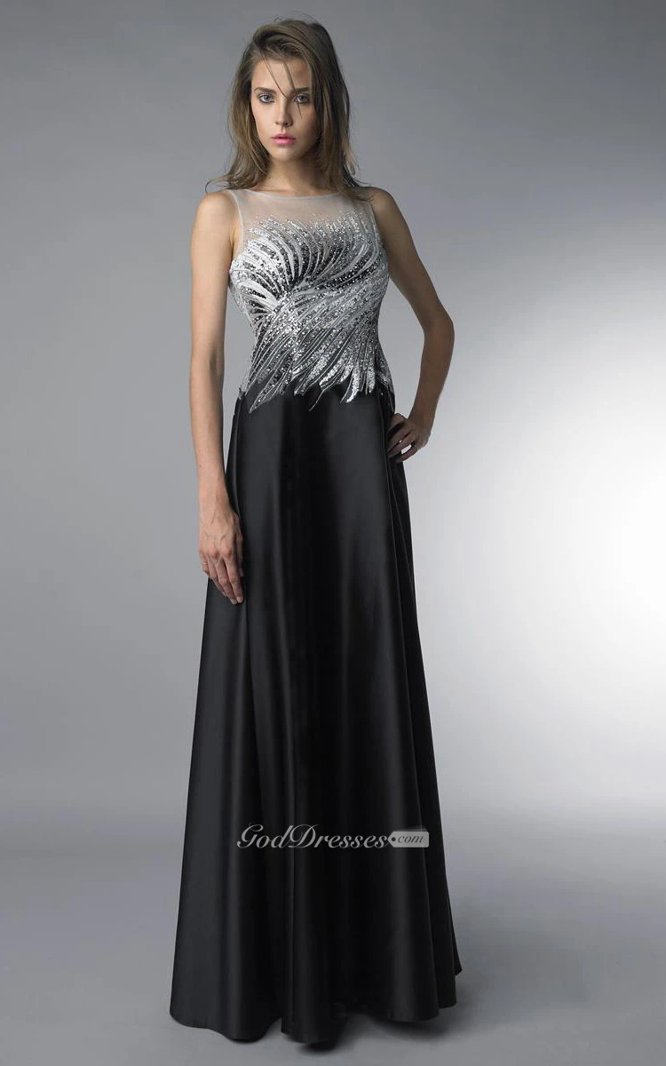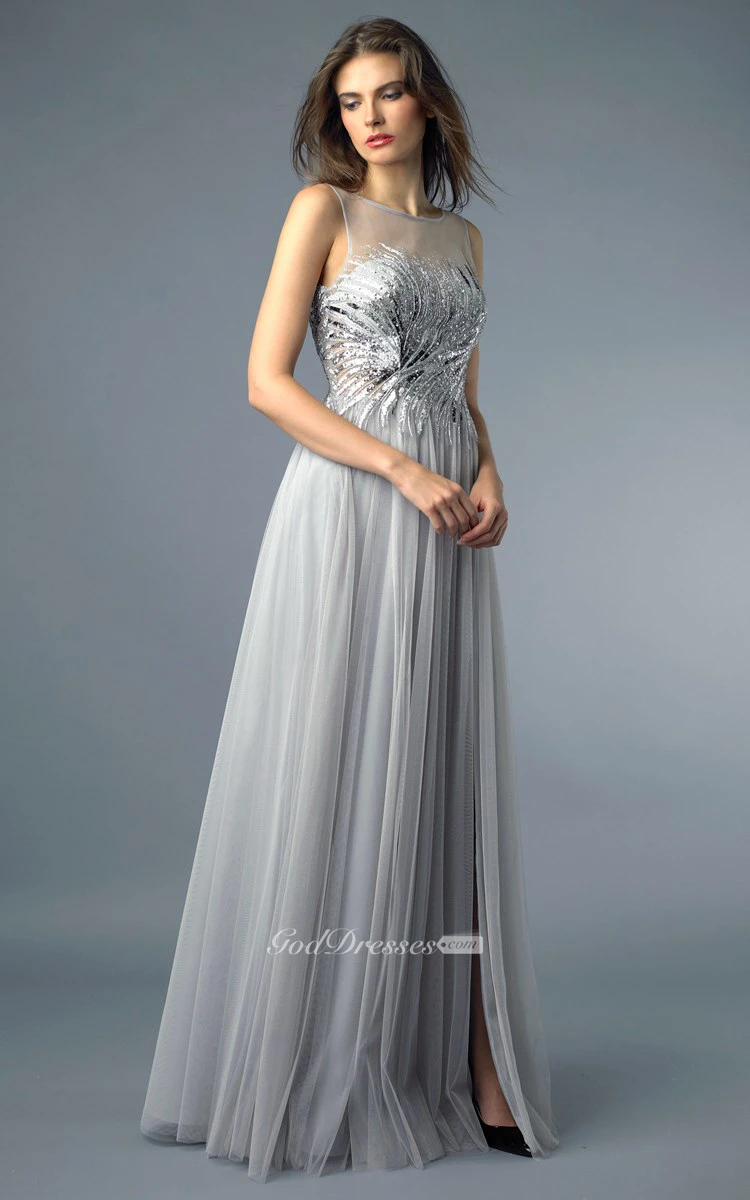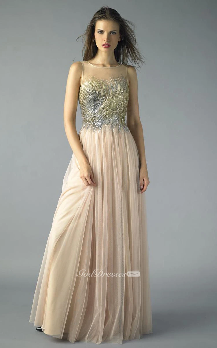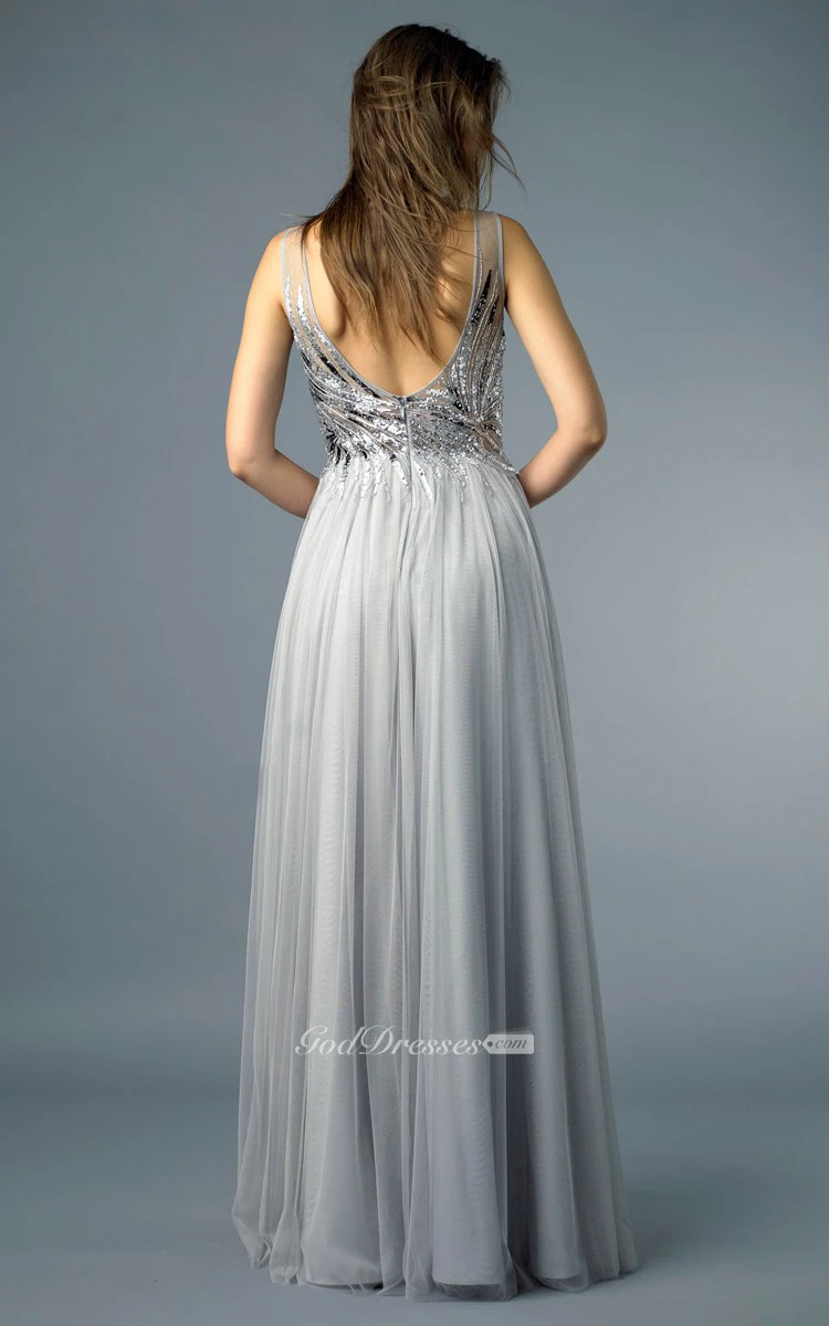 A-line Floor-length High Neck Sleeveless Tulle Low-V Back Dress