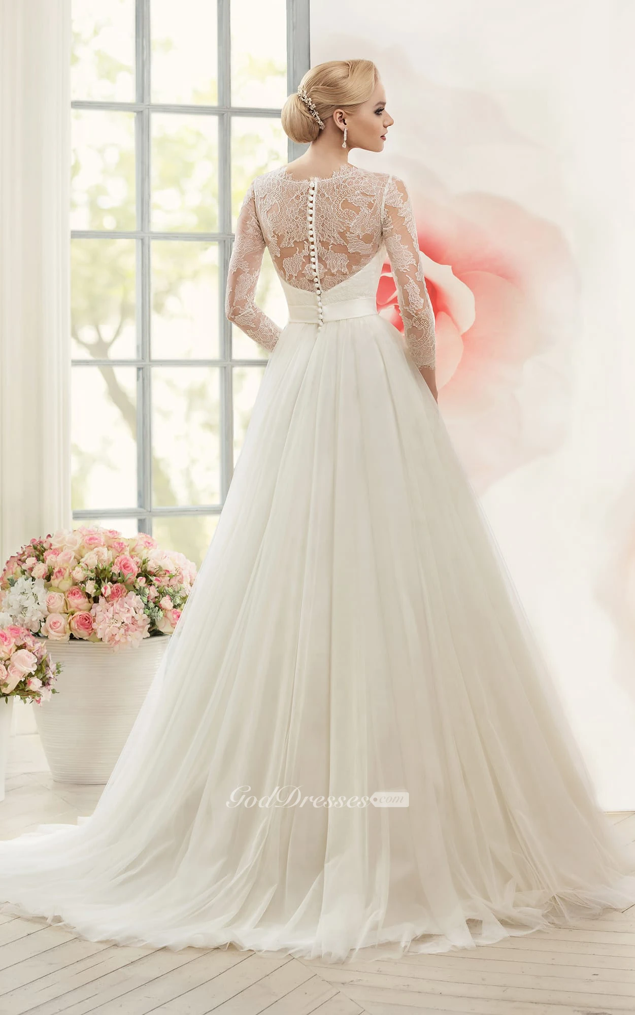 A-Line Floor-Length Jewel Long-Sleeve Illusion Tulle Dress With Lace And Waist Jewellery